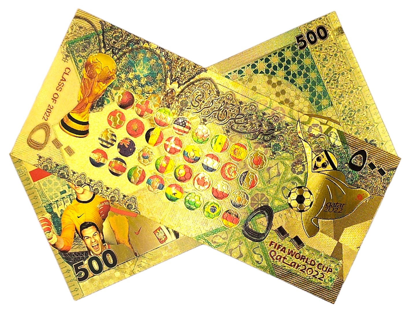 Позолоченная коллекционная банкнота номиналом 500 риалов была выпущена по случаю чемпионата мира по футболу FIFA 2022 в Катаре.