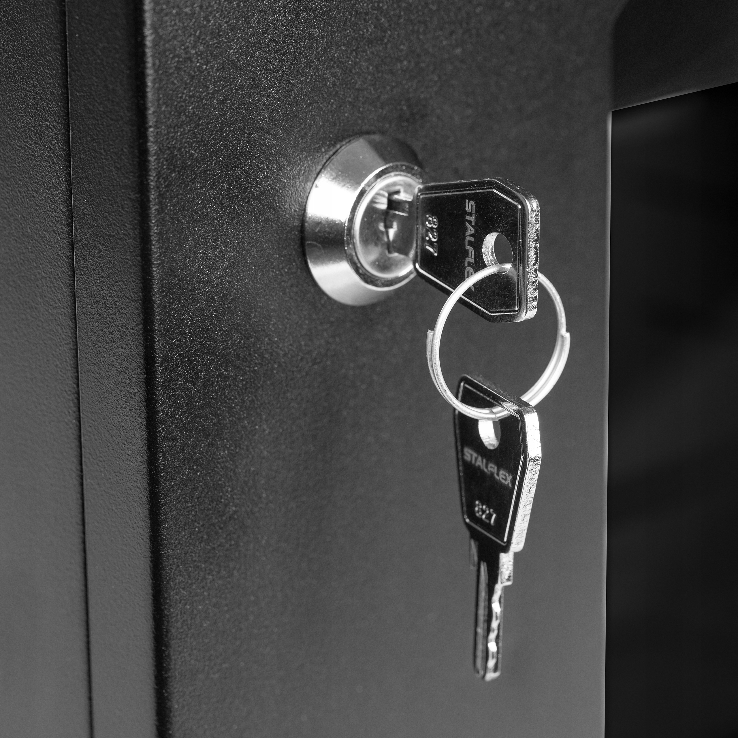 Дополнительный комфорт при установке обеспечивают удобные в установке стеклянные двери с возможностью выбора (правая/левая). Дверца запирается патентным замком (входит в комплект из двух ключей).