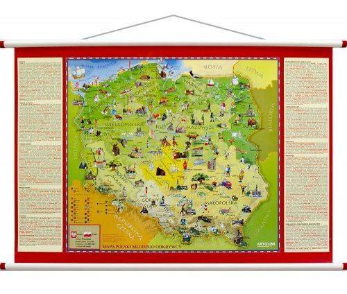Географическая настенная карта Польши для детей, имеющая образовательное и декоративное значение. С помощью красочных пиктограмм отмечены регионы и воеводства, а также топография, а также наиболее характерные здания, животные, памятники природы и события. Благодаря этому карта является увлекательным источником знаний об истории и современности нашей страны.