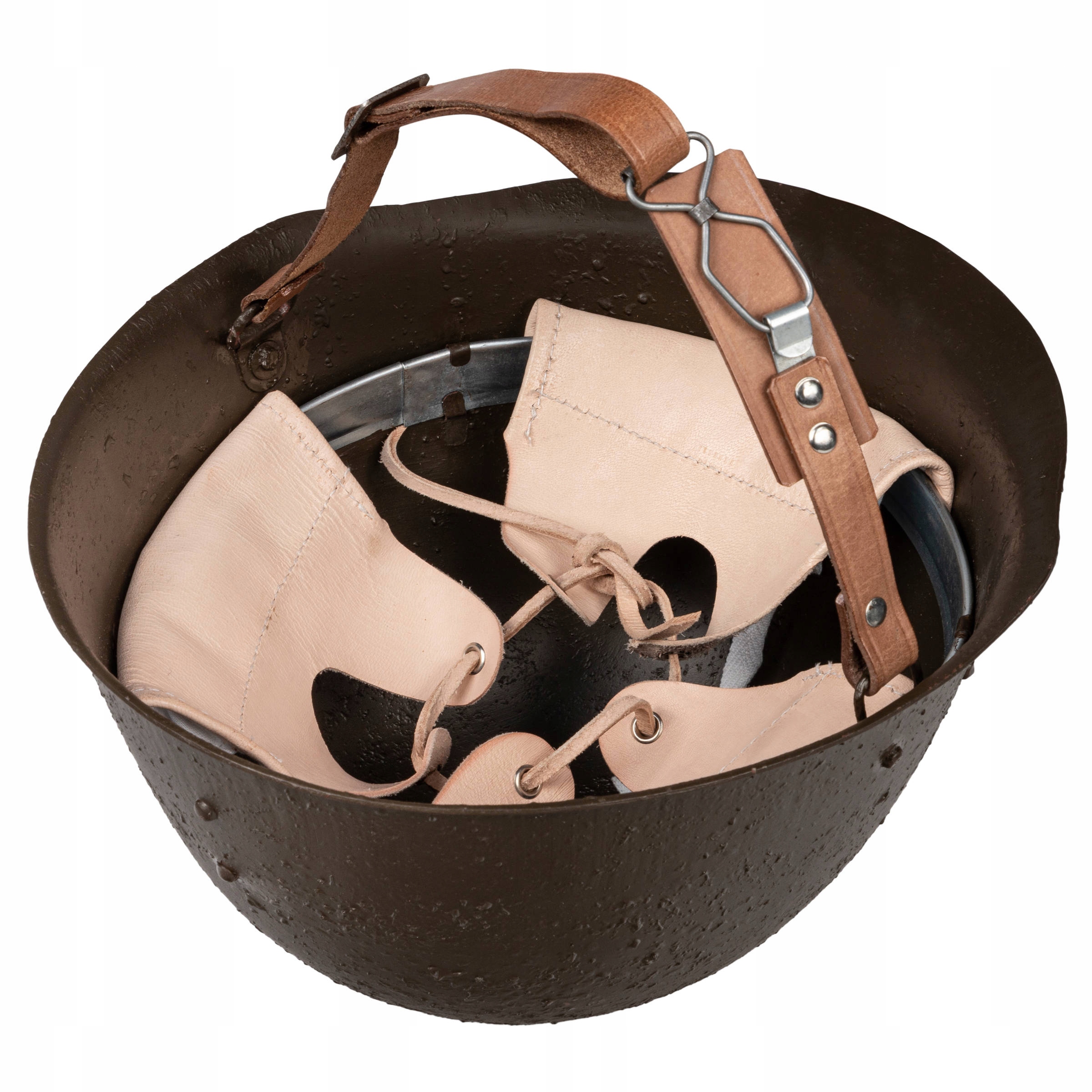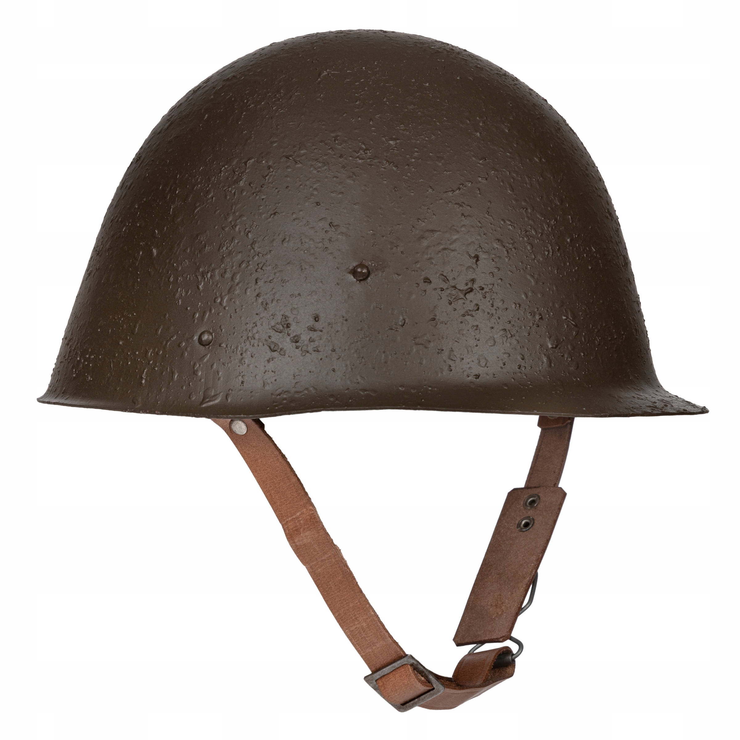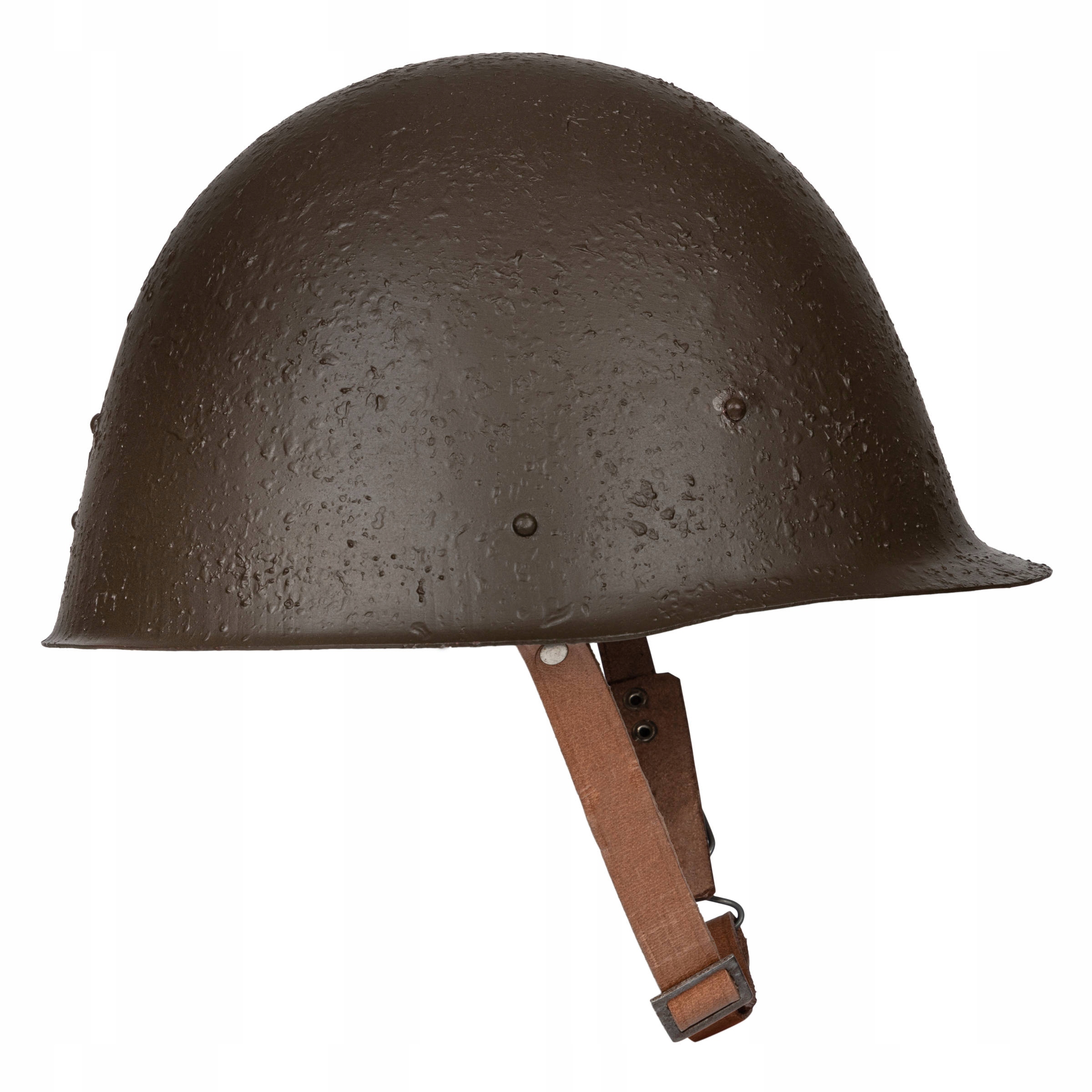 Точная копия стального шлема польской модели. 31. Реплика из штампованной стали цвета хаки с пробковым оттенком. Цельный шлем с небольшим подрезом и небольшим, но заметным контурным козырьком. Края шлема обрезаны и закруглены. Сзади шлема имеется копия контрольной заклепки. Универсальный размер – регулируется вставкой из воловьей кожи. Ремешок, крепящий шлем под шею пользователя, выполнен из кожи с металлической фурнитурой, его длина регулируется.