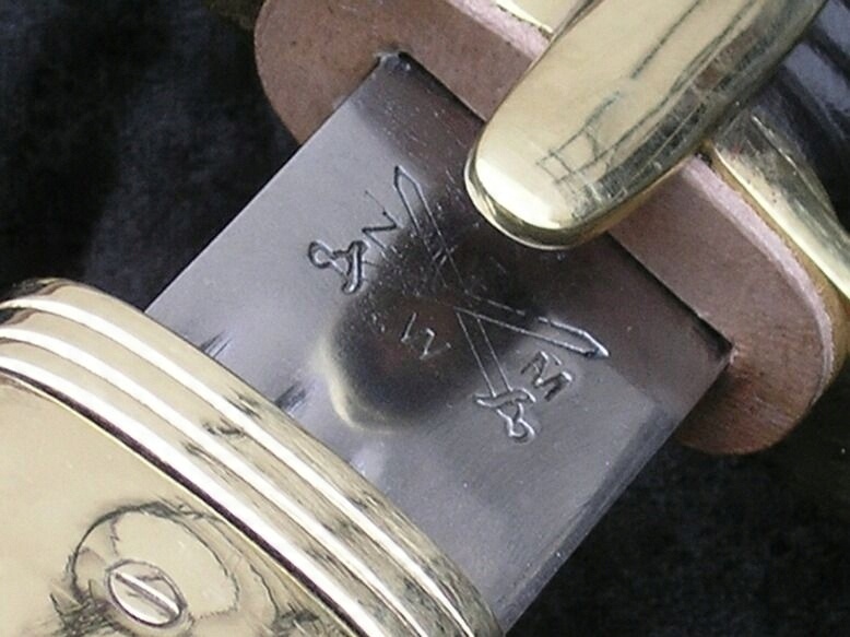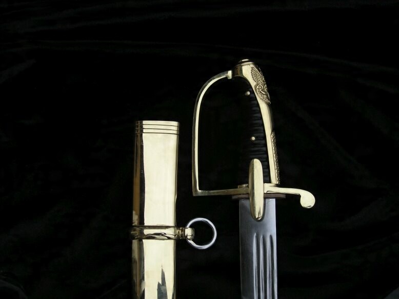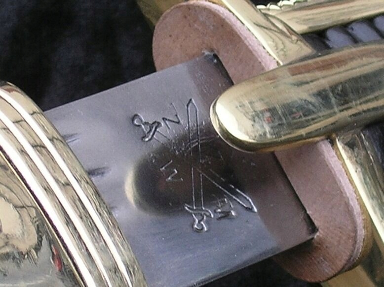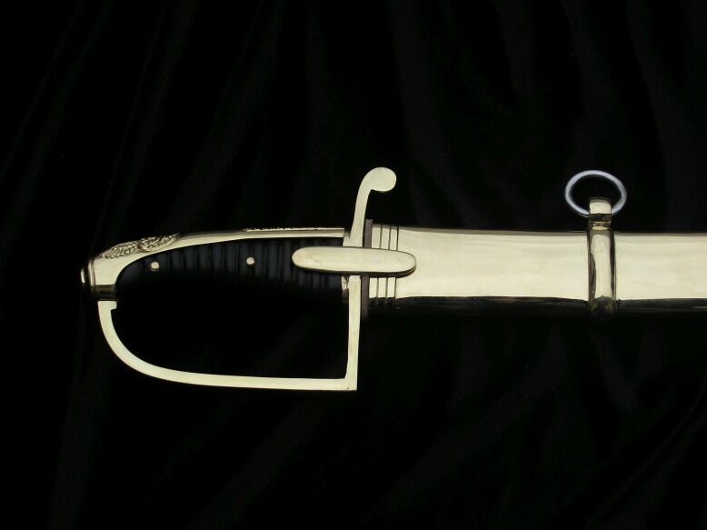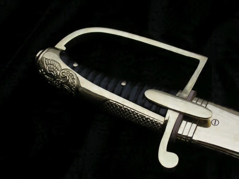 " Рукоятка закрытая, латунная оправа. Перекладина арбалета с овалом. , слегка выпуклые усы. Переднее плечо перекладины, согнутое под прямым углом, дугой простирается к голове. Заднее плечо слегка согнуто вниз, оканчивается уплощенной каплей. Голова наклонена вперед, покрыта закругленной каплей. Капюшон, переходящий в косу, доходящую до перекладины, с рельефной сеткой внизу для более надежной опоры большого пальца, посередине дополнительный щиток. Рукоять деревянная, с поперечным насечком, дополнительно скреплена двумя проходящими латунными заклепками. через хвостовик клинка (Изменение: Рукоять обтянута натуральной кожей для более надежного хвата).