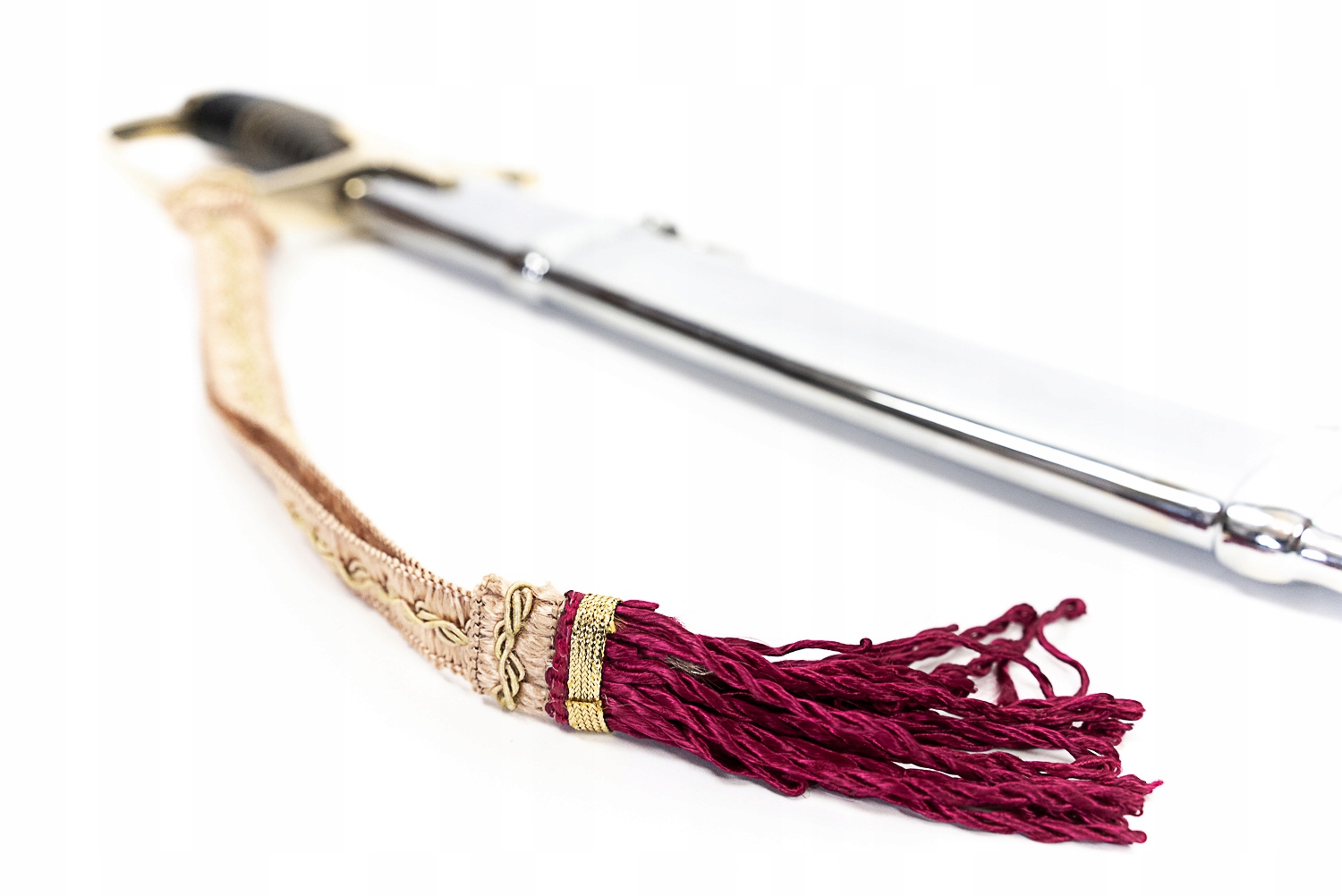- Стержень рукоятки обтянут черной кожей и переплетен золотой нитью.