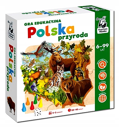 Увлекательный поход по польским национальным паркам! Польская природа – увлекательная настольная игра для всей семьи. Путешествуя по национальным паркам, игроки путешествуют по живописным регионам Польши и узнают интересные факты о растениях, животных и природных достопримечательностях. В то же время они будут решать головоломки, собирать марки и планировать собственные путешествия. Знаете ли вы... какой национальный парк называется Польская Амазонка? сколько километров составляет самая длинная горная тропа в Польше? Почему лось весом в полтонны не тонет во влажных местах? Как называют дерево, ствол которого похож на ногу слона? Ответы на эти и другие вопросы вы найдете в этой игре. Используйте свое любопытство к миру, логическое мышление и хитрость, чтобы как можно быстрее получить три сувенирные марки из похода по различным национальным паркам. Благодаря различным вариантам игрового процесса и простым правилам игру можно адаптировать под возраст и темперамент игроков. Описания множества диковин и природных достопримечательностей вдохновят вас на совместное путешествие по стране – не просто пальцем по карте! Игра «Польская природа» — это одновременно развлечение и урок польской природы и географии, тренировка мышления, памяти и восприимчивости, иллюстрации, которые производят впечатление, идея для приятного времяпрепровождения долгими вечерами, поездками на отдых или занятиями по польской природе. детский сад и школа «Капитан Наука» — бренд, созданный благодаря родителям, ищущим умные, веселые, но и требовательные развлечения для детей. Мы уделяем особое внимание загадкам, играм, головоломкам и книгам, которые обучают посредством творческой игры и поддерживают развитие ребенка. Продукция Капитана Науки адаптирована к потребностям детей от рождения до 11 лет. Они стимулируют развитие ключевых навыков, таких как концентрация, память, восприимчивость, логическое мышление и креативность. Они являются отличной альтернативой смартфону или компьютеру, а время, проведенное за играми вместе с семьей или сверстниками, укрепляет связи и коммуникативные навыки.