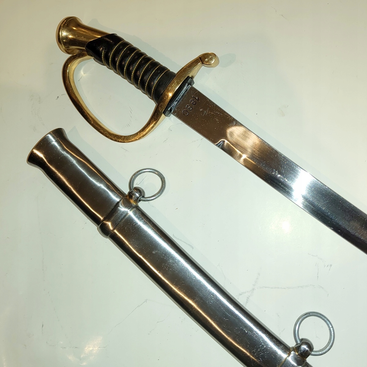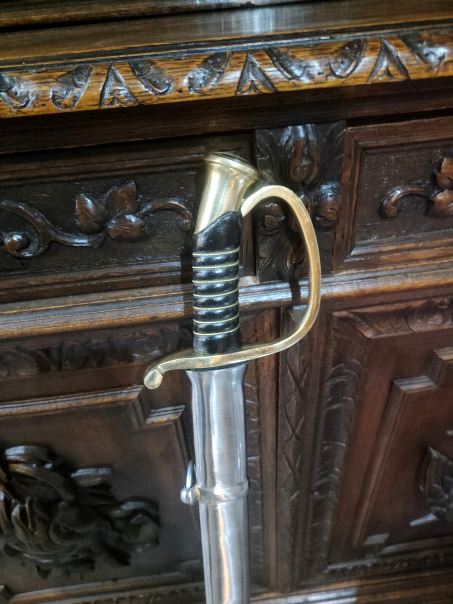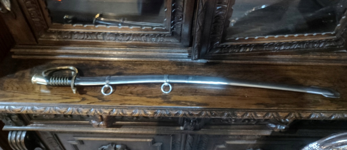 Современное изделие, очень эстетично выполненное, по образцу оригинальных экспонатов. Предназначен для украшения. Сабля изготовлена из обычной полированной стали.