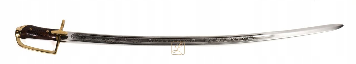 Клинок изготовлен из высококачественной, незакаленной стали, полуглянцевая отделка, красивая гравировка на внешней стороне. поверхность: между растительными орнаментами орел в короне с надписью «ГЛАВНОКОМАНДУЮЩЕМУ». Рукоять с рукояткой из дерева с ребрами. Накладки крепятся двумя стальными винтами с латунными гайками и латунным усиливающим кольцом в основании. Латунная перекладина арбалета с усами. Красиво сделанная сабля, которая эффектно смотрится на прилагаемом столе. Стол из фанеры, мориленной и покрытой матовым лаком. Сзади стола есть два крючка, которые можно повесить на стену. Работа польского мастера для презентации холодного оружия.