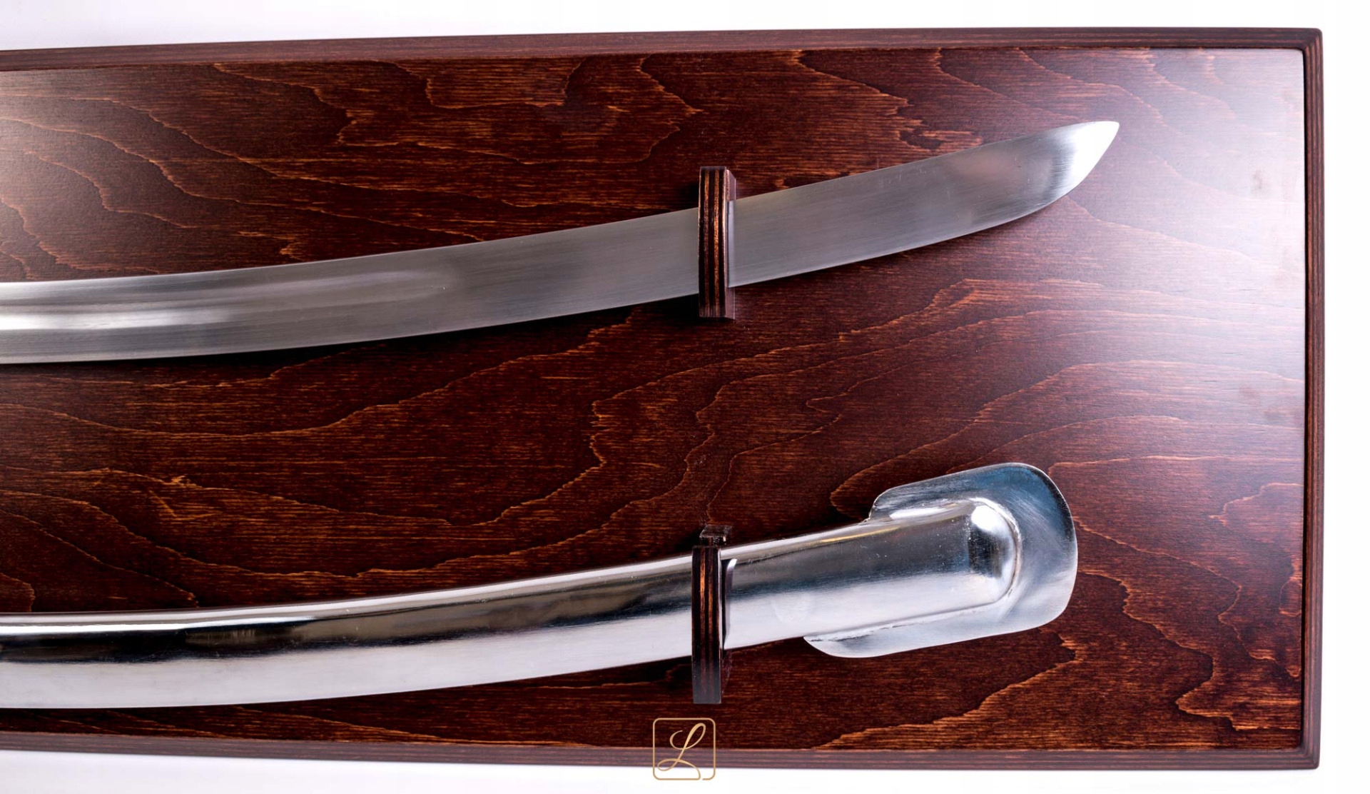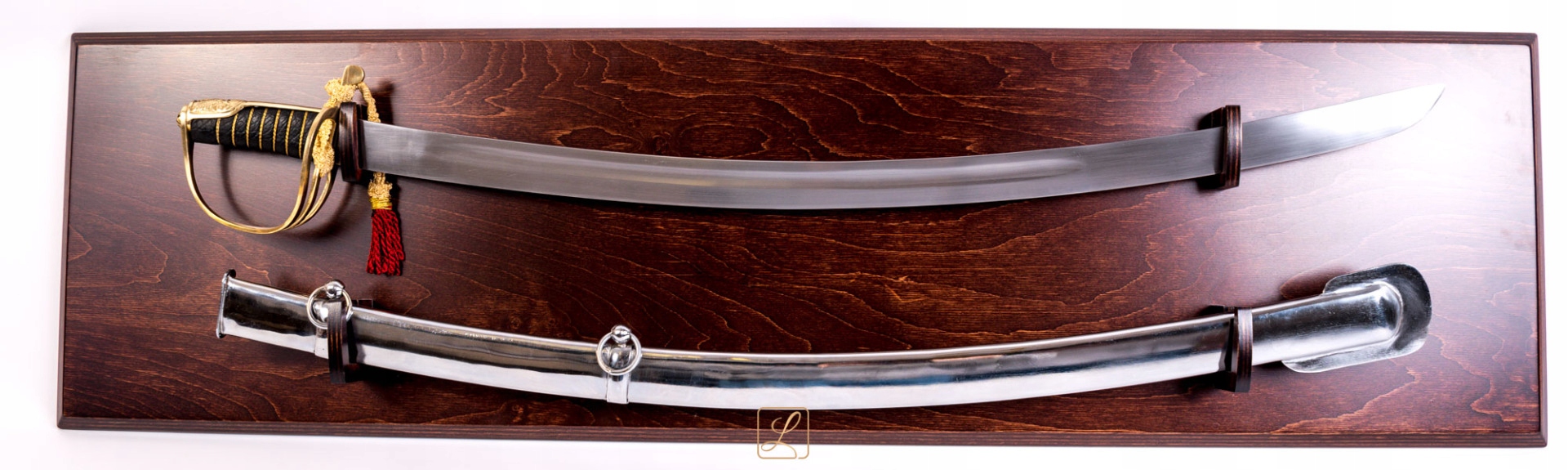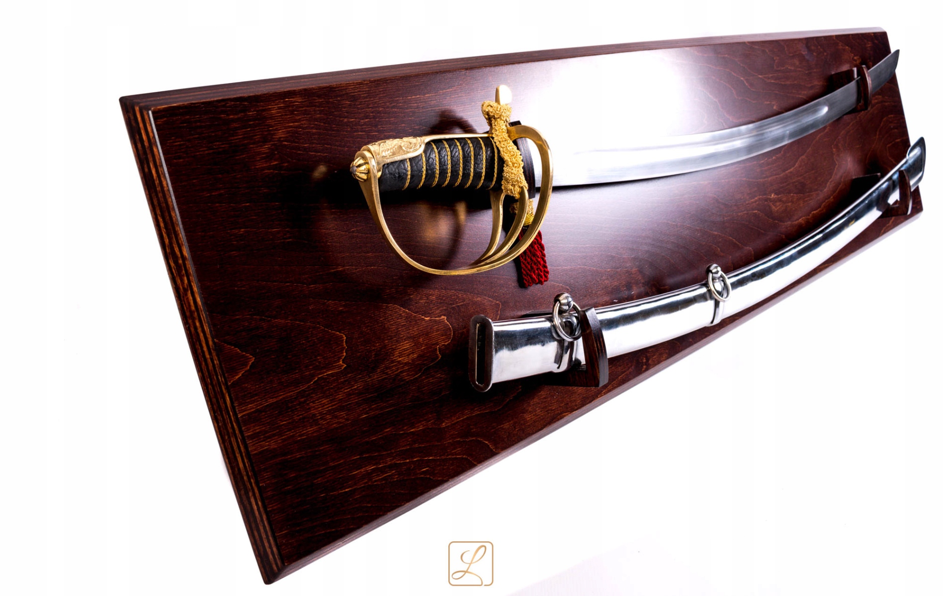 Деревянная ручка, покрытая черной кожей. Видимые ноты, заполненные латунью, скрученной проволокой, так называемые корпус. Ручка закрыта латунной трехпанельной JELC. Лезвие высококачественной стали несчастно, хранится в полу -маме. Декоративная стропа, привязанная к ручке из ткани с золотой лентой, заканчивалась красной кисточкой - куча ниток. Оловянный патч, хром с двумя гравюрами и подвижными воротниками, отделанный с брызги. Таблица из фанеры, окрашенная и лакированная для коврика. В задней части стола два крючка, чтобы повесить на стену. Работа польского мастера для презентации белого оружия.