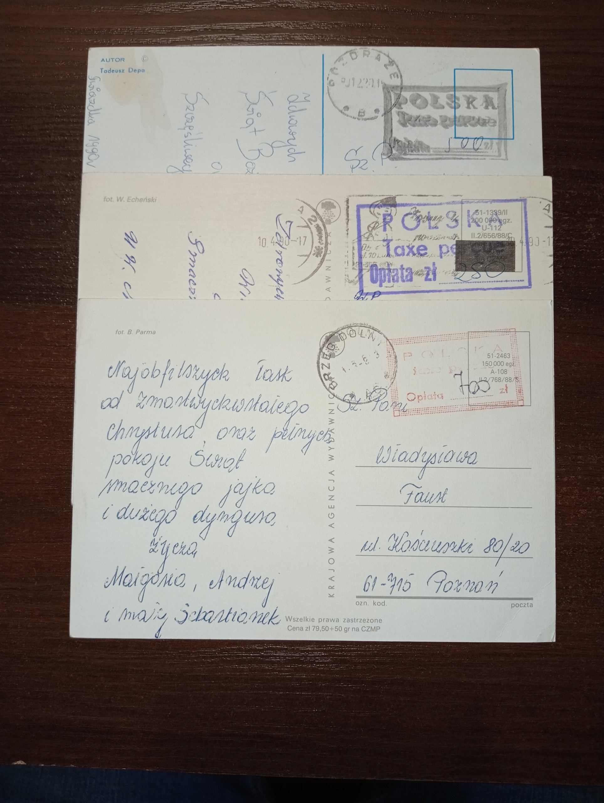 Рождественские открытки с датами разных периодов «ВЗНОС СОБРАНЫ», из трех разных городов: Гдыня, Роздражев и Бжег-Дольны. В хорошем состоянии. Приглашаю вас покупать и на другие мои аукционы, где я предлагаю различные виды предметов из моих ликвидированных коллекций.