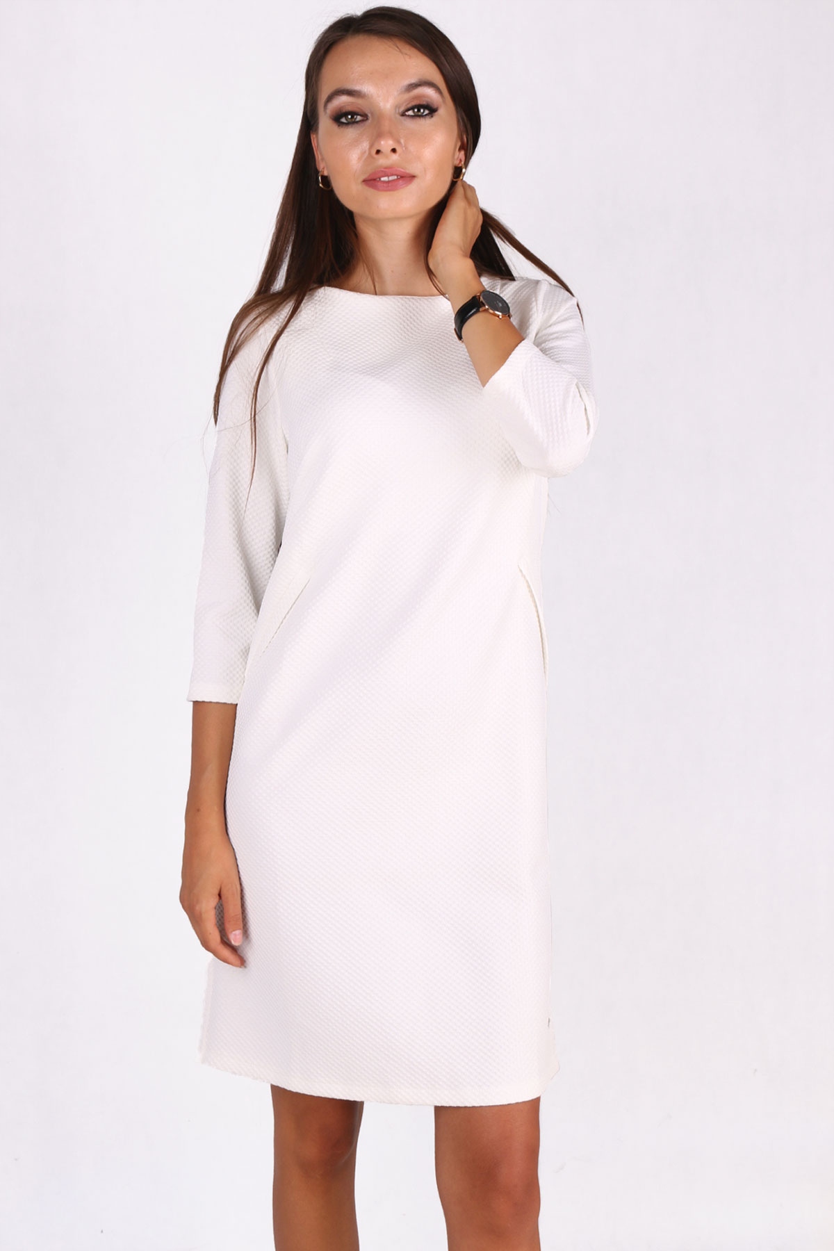 Классическое, элегантное белоснежное платье. Платье женственное, красиво подчеркивает фигуру, но не обтягивающее. Это делает его комфортным. Платье не имеет большого выреза, что делает его идеальным нарядом для работы или элегантных встреч. Платье имеет имитационные карманы на уровне бедер, что визуально стройнит фигуру. Золотая пластина с логотипом компании на коленях придает платью роскошный вид и делает его гораздо более дорогой вещью. Платье обязательно выделится в вашем гардеробе еще и за счет структуры материала, которую можно назвать имитацией «мурашки».