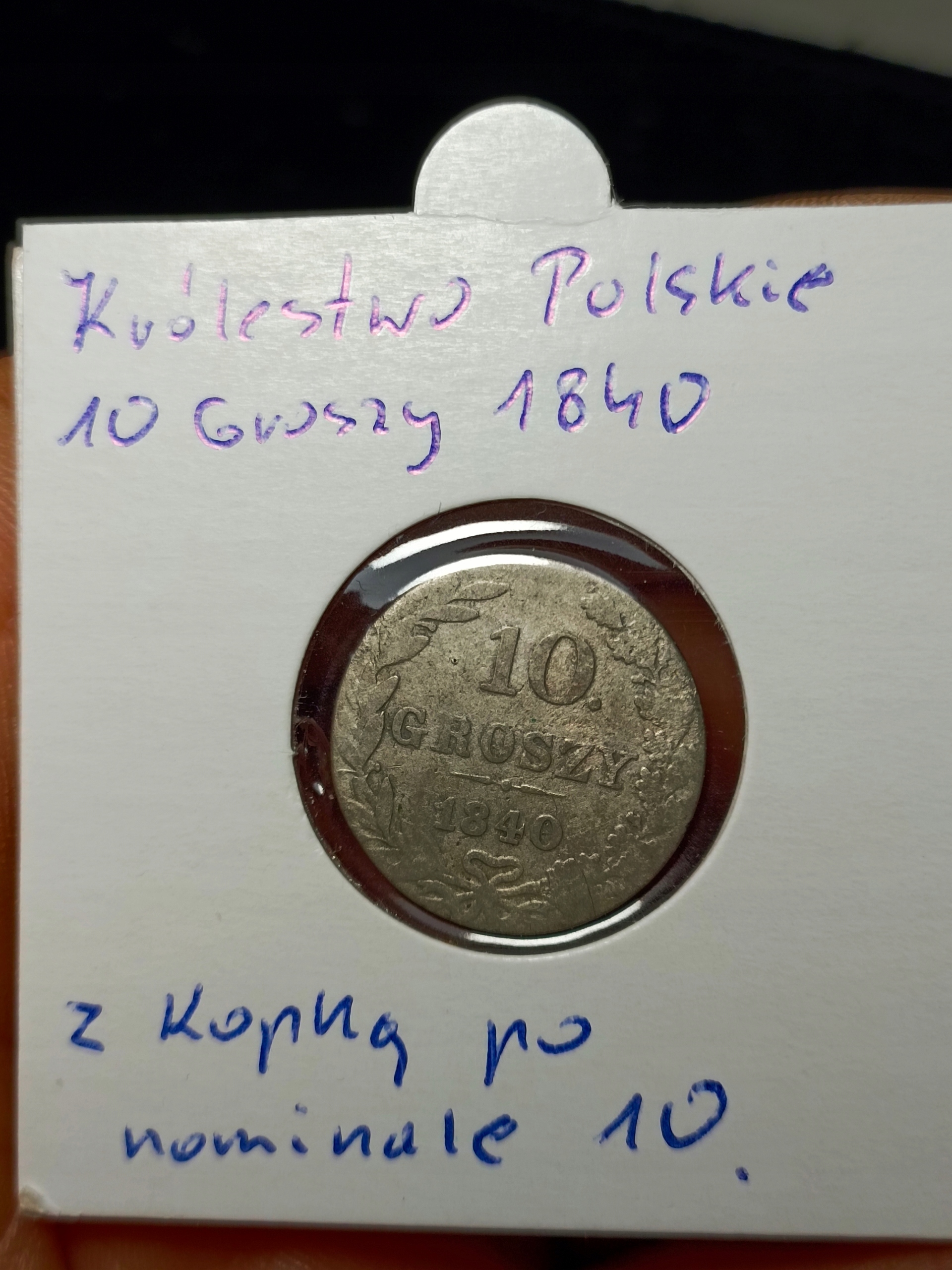 Серебро. Монета номиналом 10 грошей 1840 года с точкой после цифры 10 представляет собой редкую разновидность монеты Королевства Польского, которая, согласно нумизматическим источникам, очень мало известна на рынке, с маркировкой RR-[очень редко]. Хотя монета датирована 1840 годом, точка была введена в обращение в 1841 году для целей контроля монетного двора, но ее выпуск был прекращен.