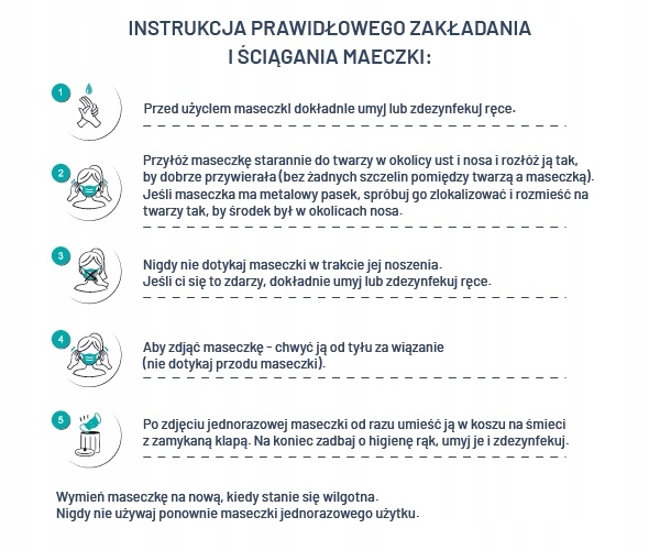 4. Снятая маска должна быть помещена в закрытый контейнер. Наконец, необходимо вымыть руки водой и мылом или дезинфицировать их