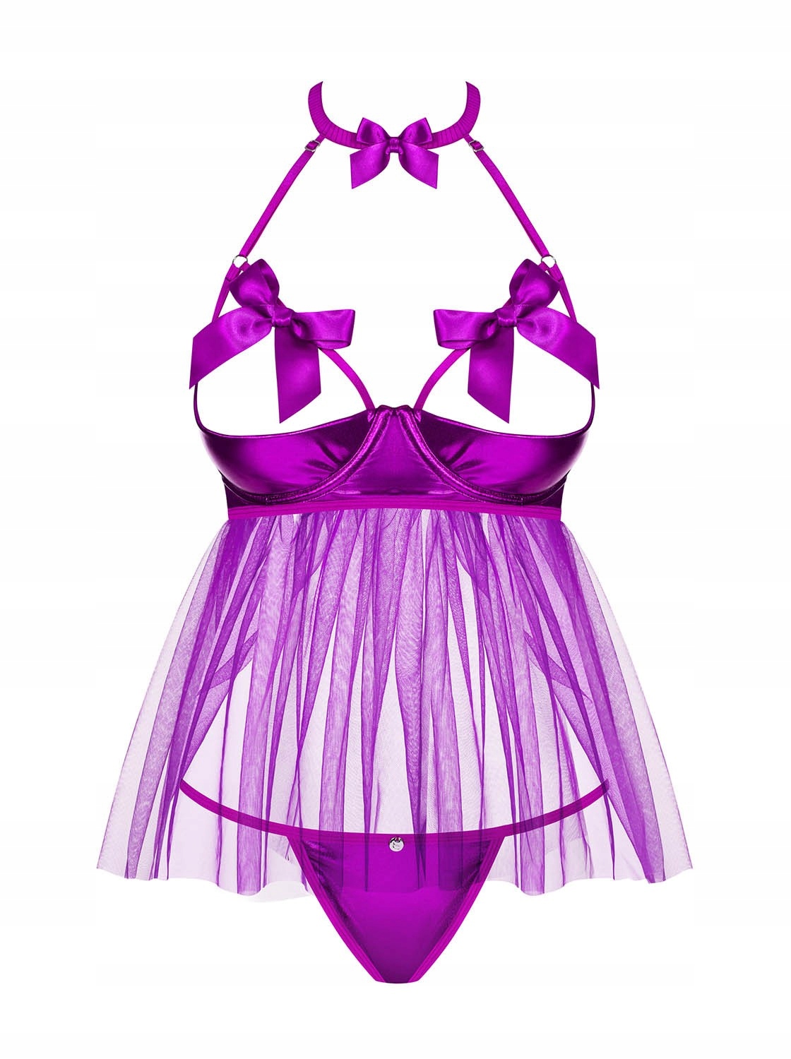 Потрясающая куколка – добавляет шарма и пикантности! Ремешок в виде колье, застегивающийся на шее, невероятно очаровательный и возбуждающий. Многоступенчатая застежка сзади плюс эластичные бретели, украшающие спину. Регулируемые бретели – идеальная посадка. Открытый бюстгальтер с декоративными бантами - привлекает внимание к красиво обнаженной груди. Мягкие чашки и косточки – полноценный акцент на груди. Сексуальный, блестящий материал под грудью, феноменальная прозрачная ткань внизу. В комплект входит бэбидолл и декорированные стринги. Приятный, нежный материал.