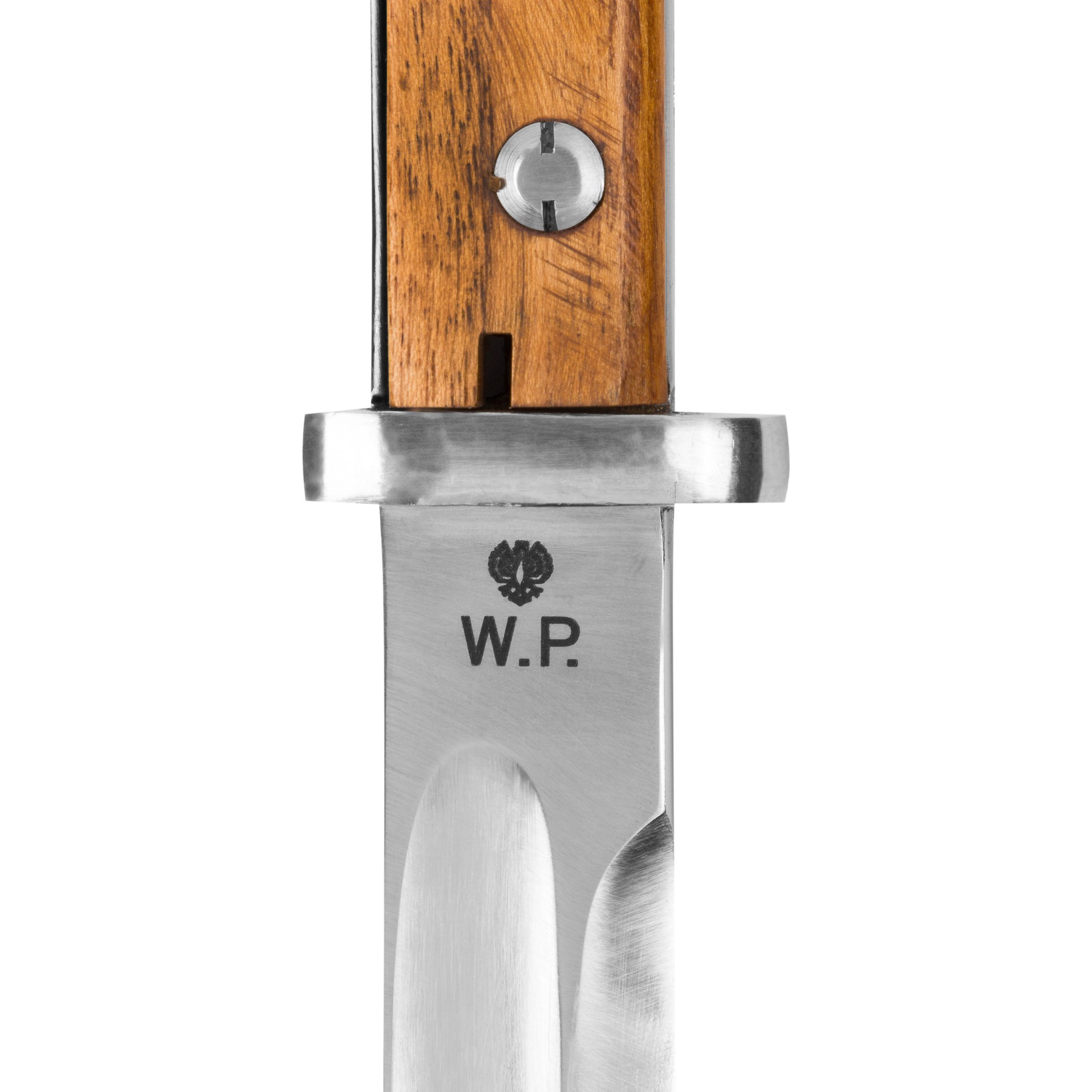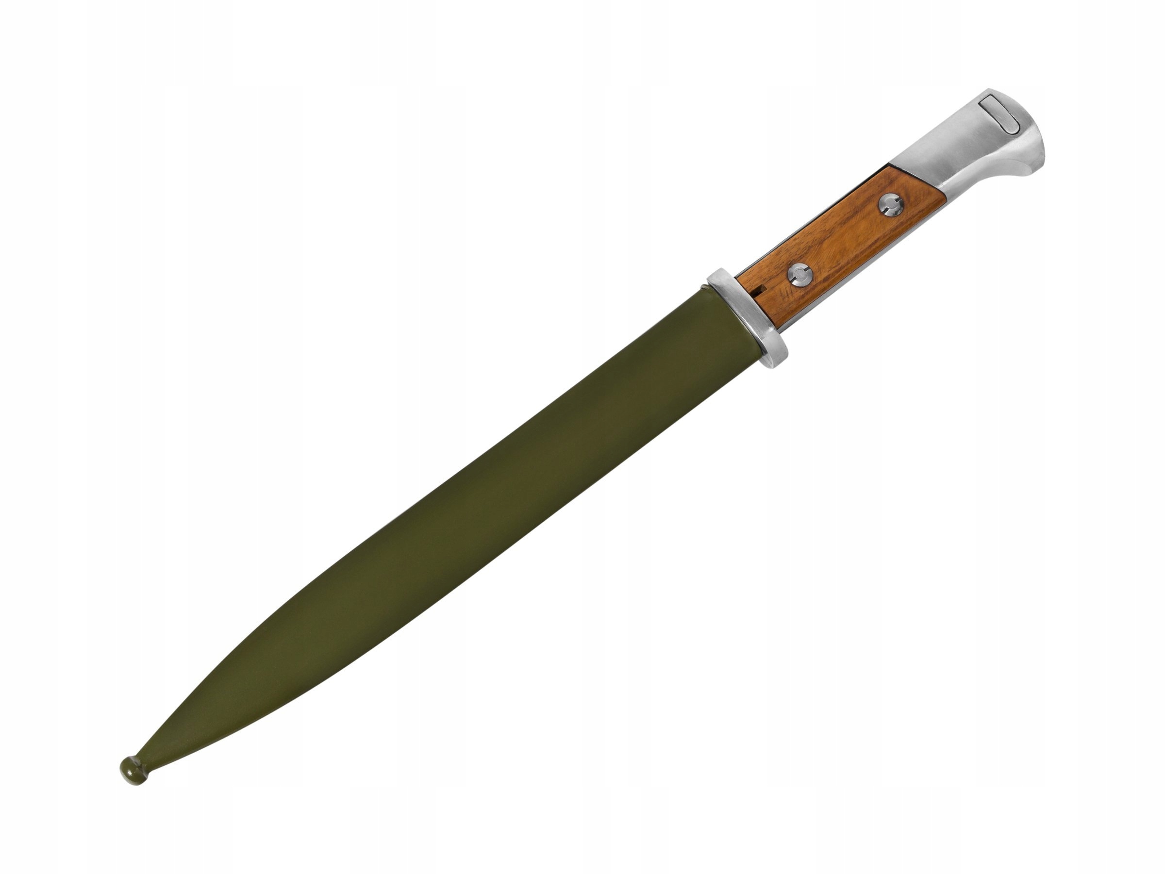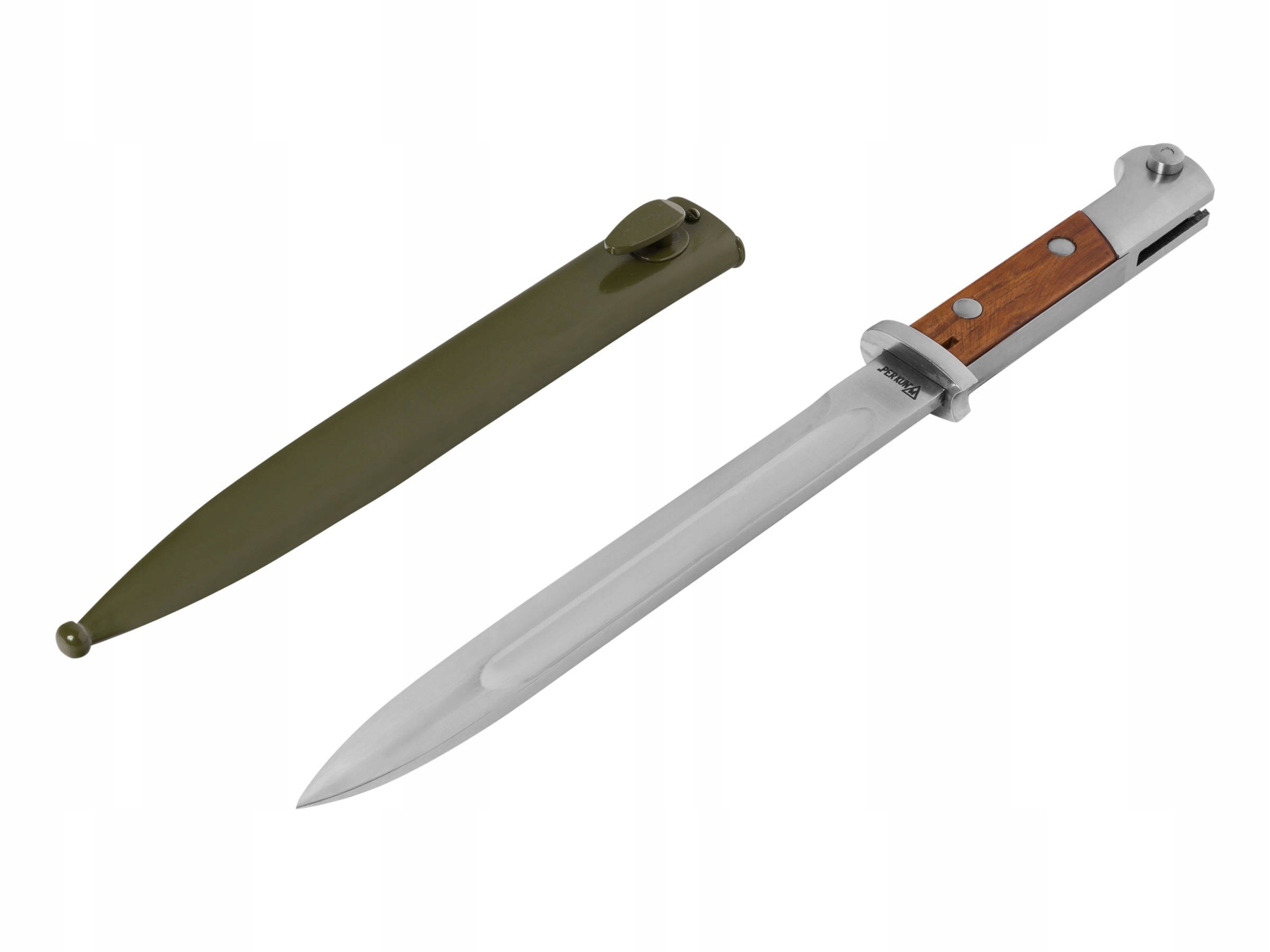 Идеальная копия польского штыка wz. 24 Перкун. Штык изготовлен из стали и имеет деревянные накладки. Ножны окрашены специально подобранной защитной краской, которая также доступна в нашем магазине. Штык полностью пригоден для использования и может быть прикреплен к винтовке. Реплика имеет исторически точные маркировки. Определенно рекомендуем!