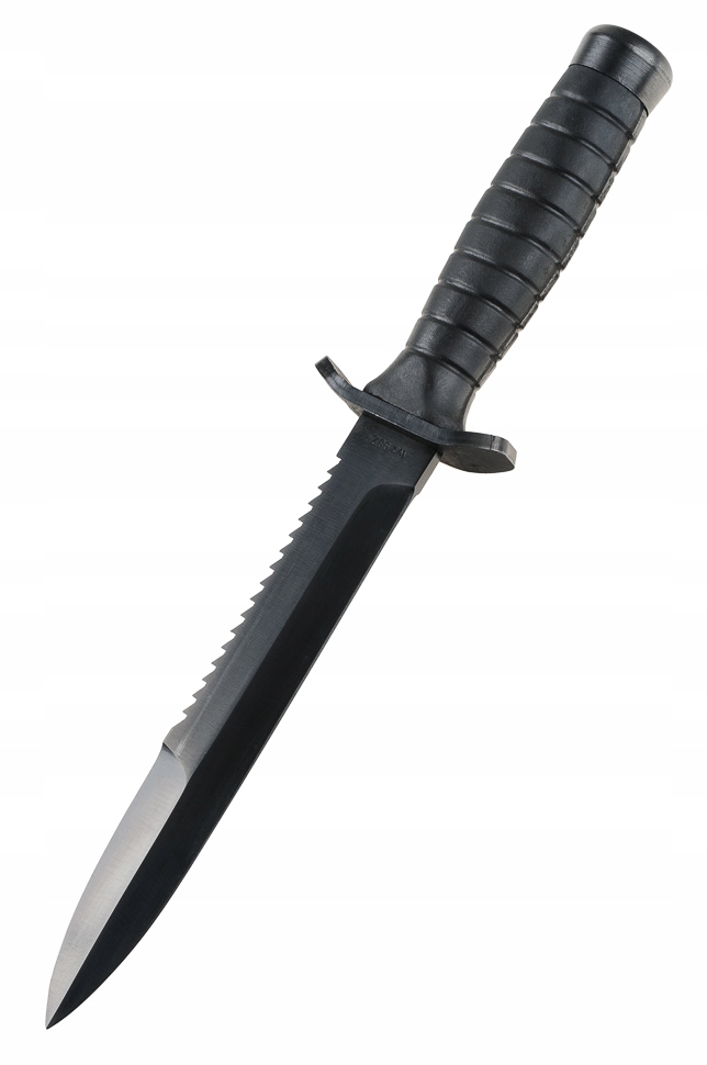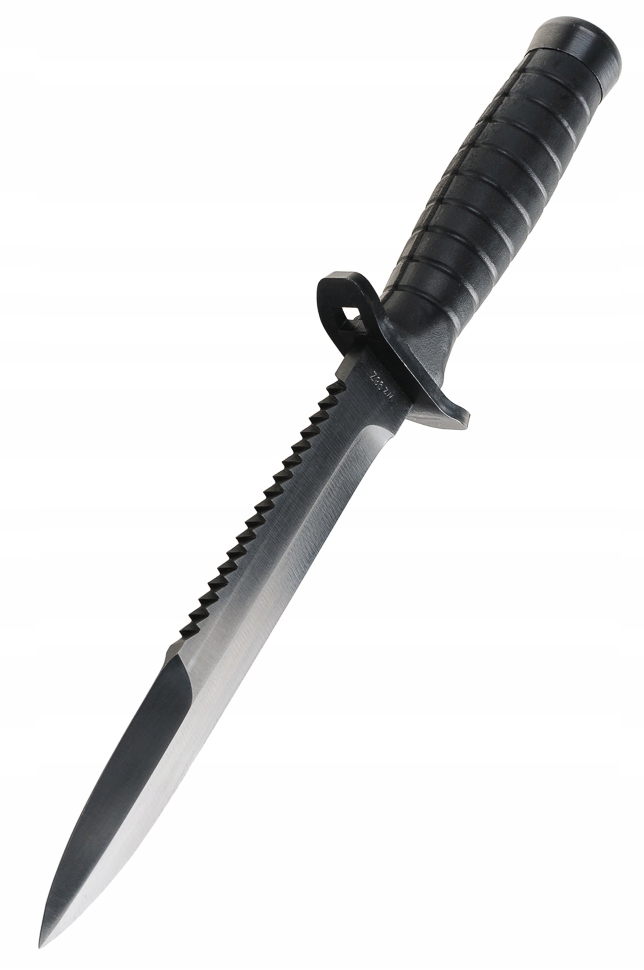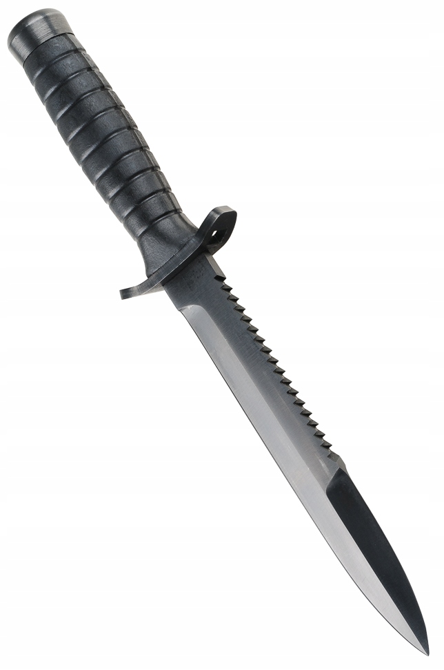 Прочная конструкция Hidden Tang, нож во всю длину изготовлен из цельного куска металла. Такое решение гарантирует высокую устойчивость к нагрузкам и прочное крепление ручки. Лезвие изготовлено из кованой пружинной стали с повышенной устойчивостью к сколам и изломам. Лезвие оксидировано для защиты от отражений света. Длинное, узкое и острое лезвие, характерное для кинжалов Spear Point. Гладкое лезвие заточено под оптимальным углом, что обеспечивает большую устойчивость к затуплению. Заостренный кончик лезвия имеет виртуальное лезвие, увеличивающее колющую способность ножа. Двухрядная пила с острыми, чередующимися зубьями. Зубья позволяют пилить и рвать твердые материалы — идеально подходят для резки веревок, кабелей, тканей, дерева и пластика. Эргономичная ручка из маслостойкой резины. Веретенообразная форма и дополнительные ребра резины обеспечивают отличное сцепление. Противоскользящая ручка поглощает вибрации и не примерзает к перчатке. Двусторонняя кованая стальная защита защищает руку от соскальзывания на лезвие. Плоская головка рукоятки позволяет использовать нож как молоток.