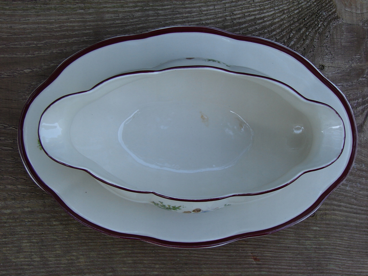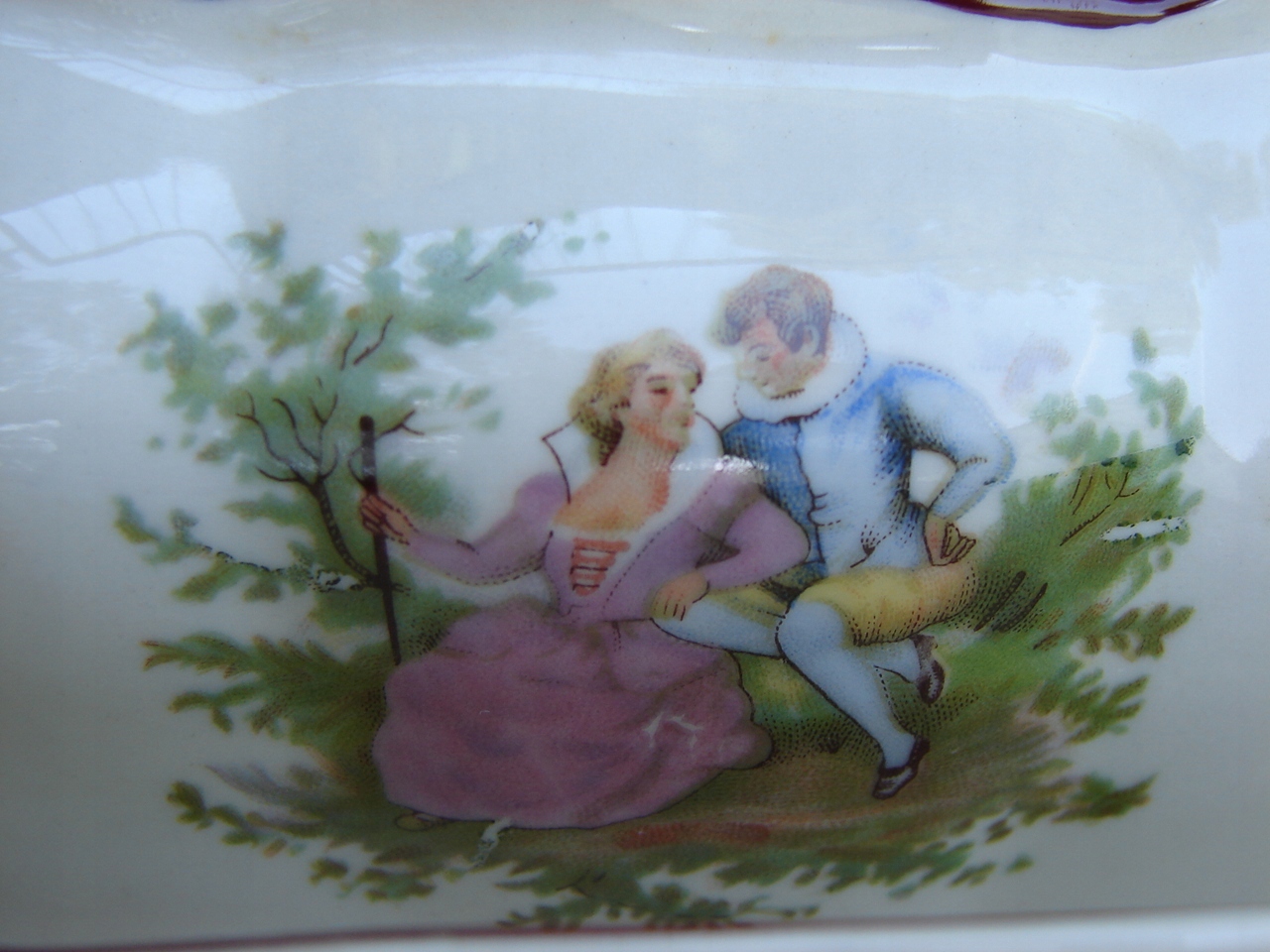 Старинный соусник, украшенный жанровой сценой с фигурами и элементами пейзажа, края основания и верхняя часть имеют декоративную коричневую окантовку, что добавляет элегантности и подчеркивает форму сосуда.
