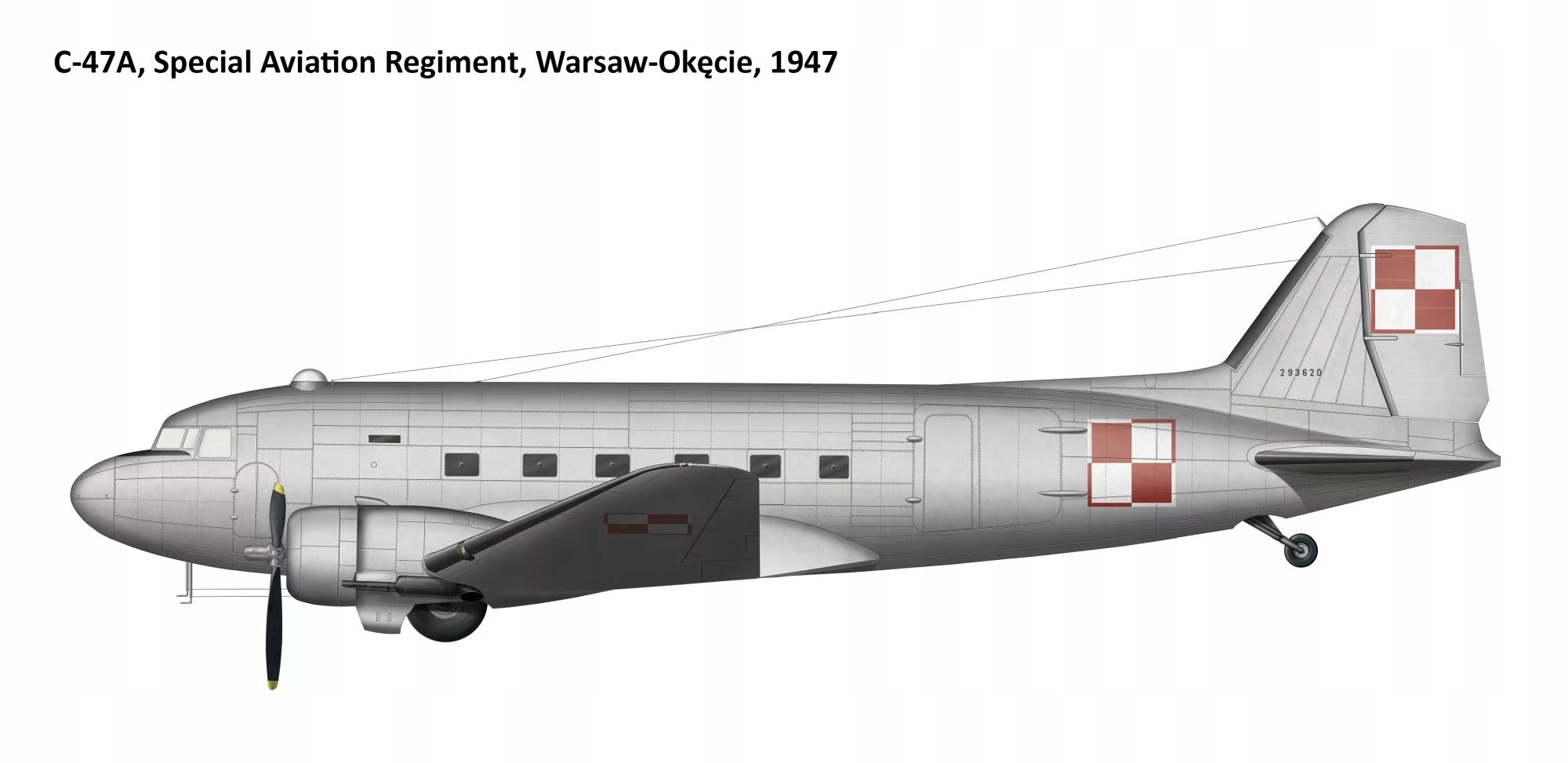 Douglas C-47A Skytrain — военная версия знаменитого пассажирского самолета DC-3, одного из самых надежных и универсальных транспортных средств Второй мировой войны. В ВВС Польши и в гражданской авиации после войны эта машина написала очень важную главу. Во время Второй мировой войны польские пилоты в Великобритании использовали C-47A в частях RAF. В основном они использовались для перевозки солдат и припасов, эвакуации раненых, выполнения функций связи и участия в крупных операциях союзников (например, Market Garden - хотя это не были машины, принадлежащие польскому подразделению, поляки летали на них в составе экипажей Королевских ВВС). С-47А ценили за надежность, большую грузоподъемность и простоту эксплуатации. После 1945 года несколько единиц С-47А попали в Польшу - как за счет советской поддержки (ленд-лиз вернулся в СССР и передался дальше), так и за счет ресурсов, оставшихся в Европе.