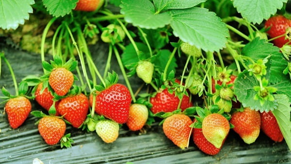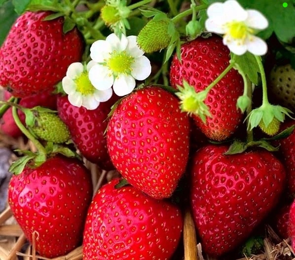 Плоды появляются очень рано – примерно через 4 месяца после посева. У них темно-красная кожица, они довольно крупные и имеют типичную для клубники коническую форму. Их красная мякоть очень сочная и твердая.