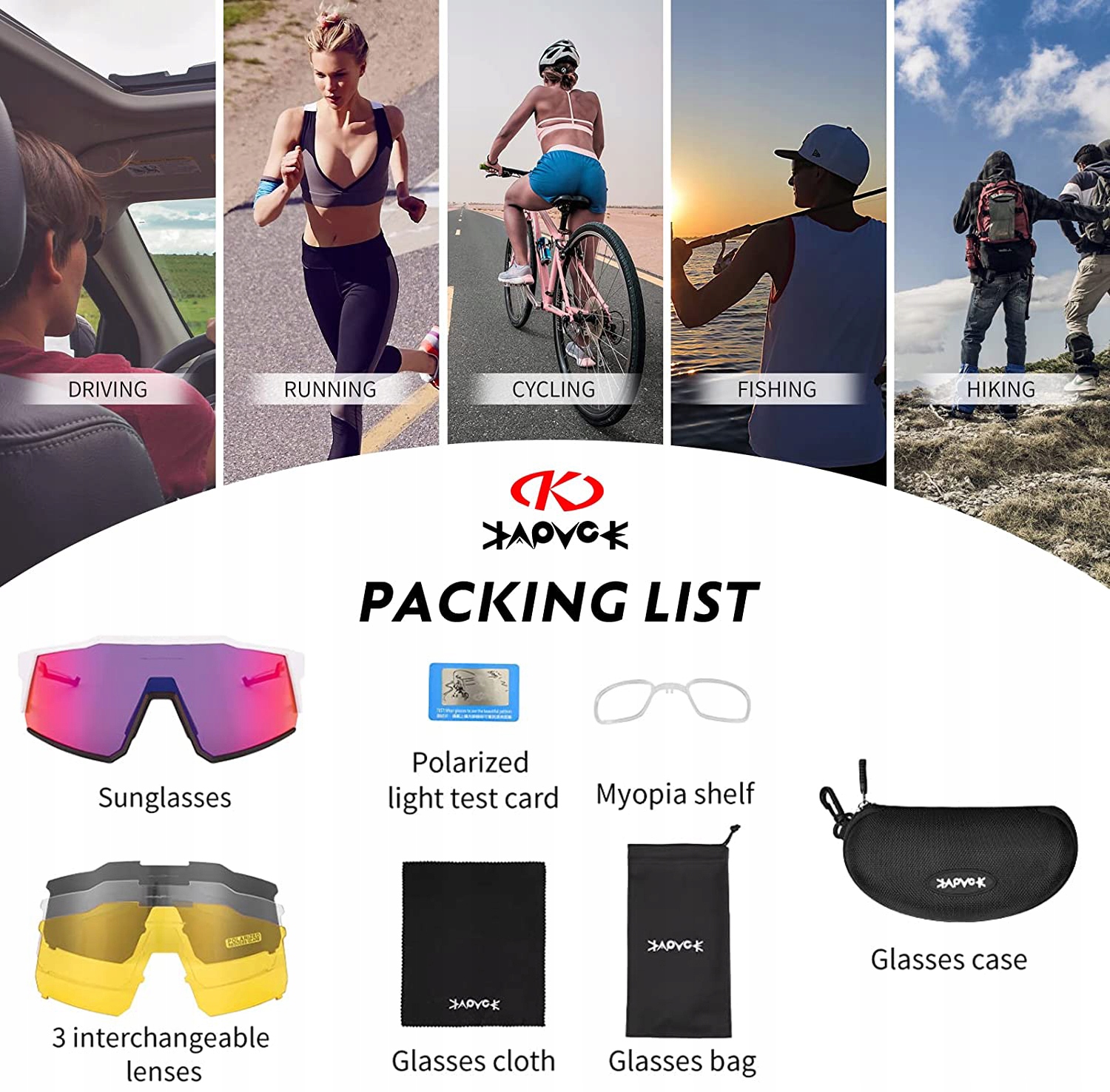 【4 сменных линзы】 Велосипедные очки KAPVOE оснащены 4 сменными линзами для защиты от ультрафиолета, но только черные линзы поляризованы. Восстановите истинный цвет, устраните отраженный и рассеянный свет. Линзы HD Clear подходят для облачного неба. В условиях низкой освещенности зрение четкое. Желтые линзы подходят для ночных и темных условий, усиливая освещение.