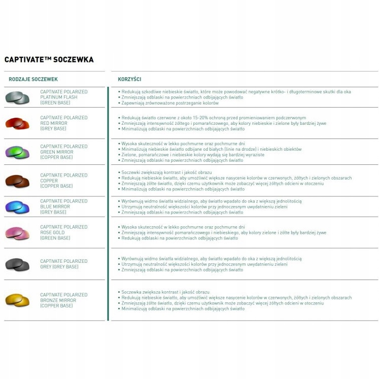 - Линзы выравнивают спектр видимого света, благодаря чему свет достигает глаза более равномерно. Они сохраняют нейтральность большинства цветов, усиливая при этом зеленый цвет; уменьшить блики на отражающих поверхностях; улучшается контрастность и цветопередача на открытом воздухе.