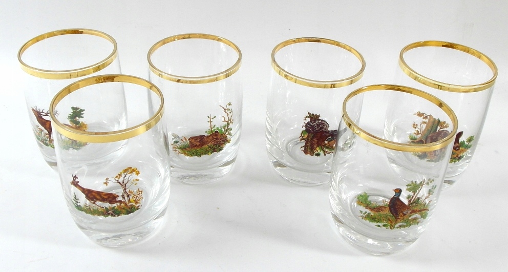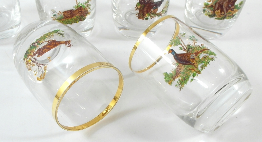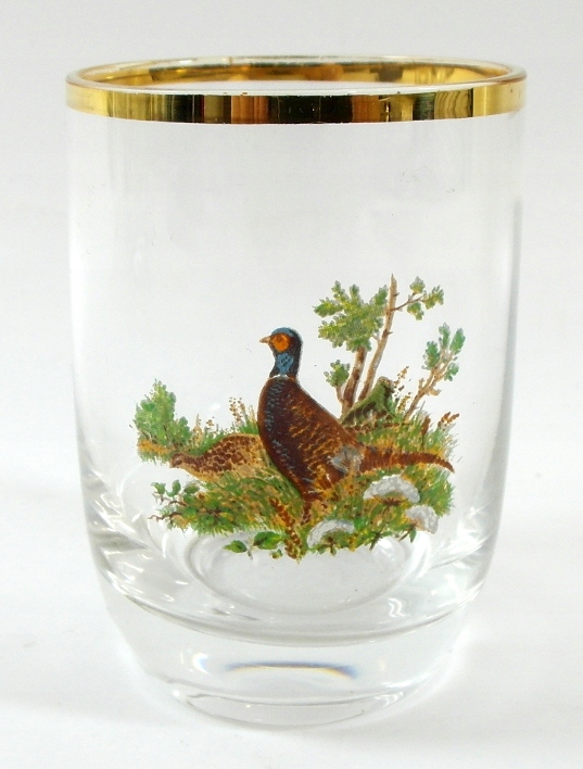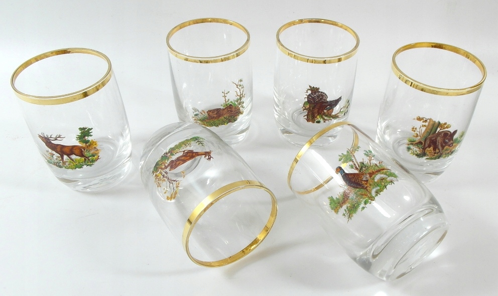 Красивые старинные стаканы для водки, набор из 6 штук. Стекло хрустальное, бесцветное, украшенное позолотой. Богемия.