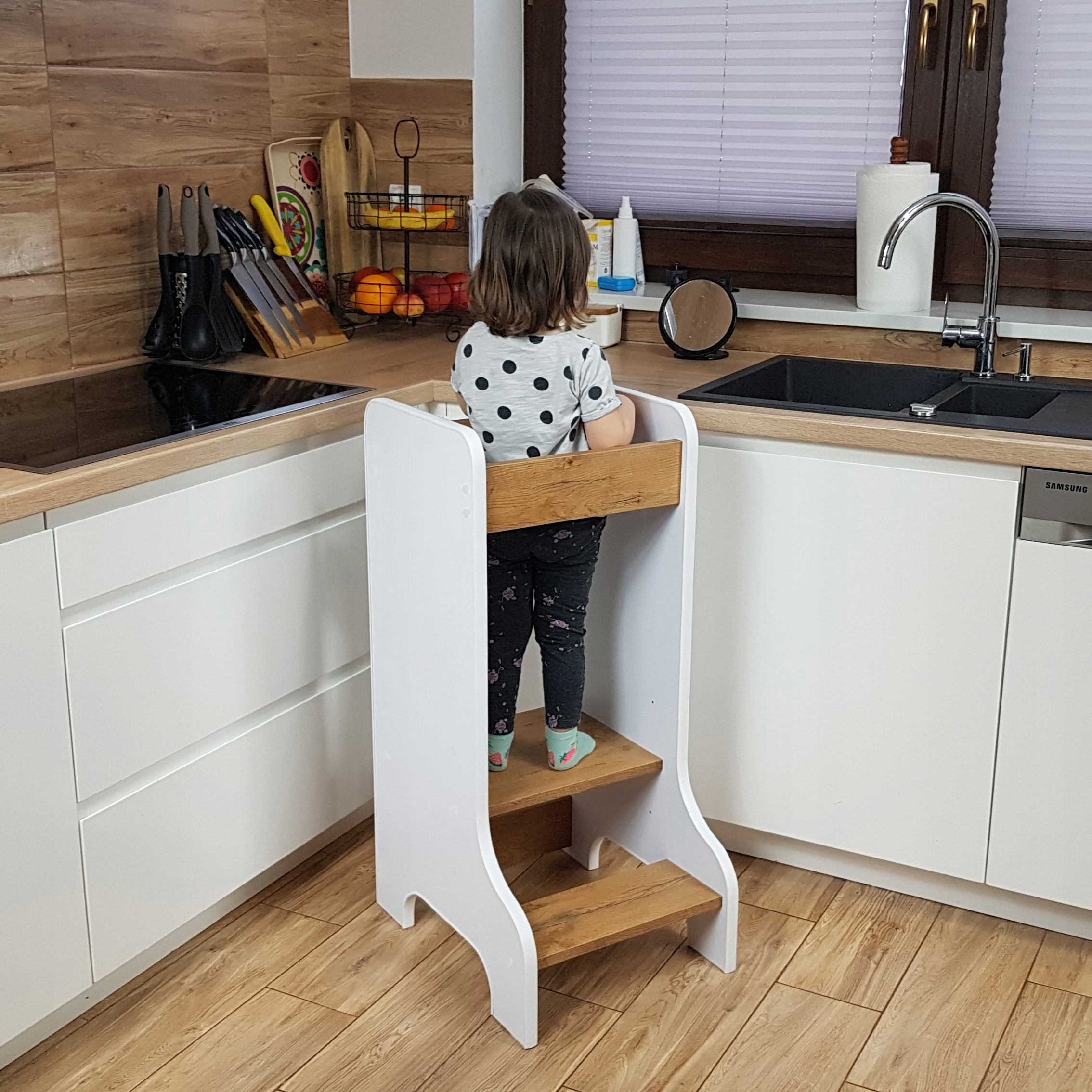 Наш кухонный помощник — это надежный продукт, который полностью производится в Польше. Мы построили его из ламинированного ДСП, поэтому он весит немного, поэтому его можно легко переместить куда угодно. Мы покрыли все это мягким ПВХ, чтобы ни один острый край или выступающая заноза не представляли угрозы для ребенка. Все винты закрыты самоклеящимися колпачками, входящими в комплект.