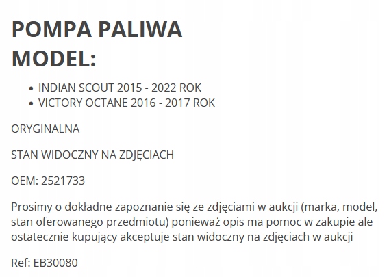 Просматривая «Pompa paliwa OEM INDIAN SCOUT 2015 - 2022», вы можете быть уверены, что данный товар из каталога «[rubrica_name]» будет доставлен из Польши и проверен на целостность. В цене товара, указанной на сайте, учтена доставка из Польши. Внимание!!! Товары для Евросоюза, согласно законодательству стран Евросоюза, могут отличаться упаковкой или наполнением.