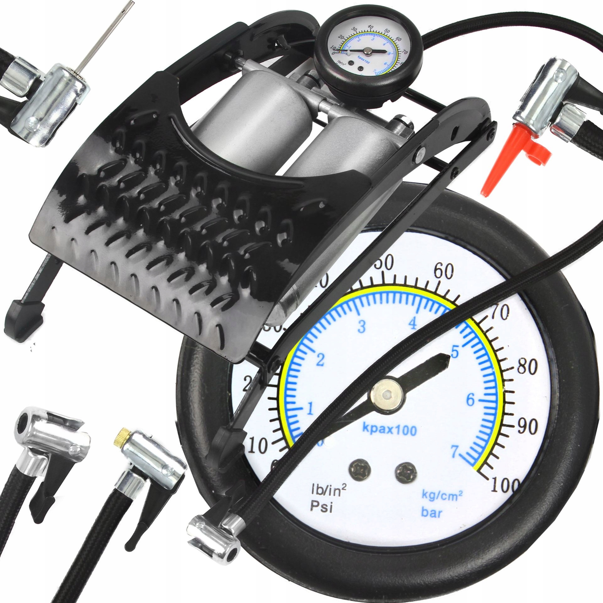 ДВУХПОРШНЕВОЙ АВТОМОБИЛЬНЫЙ НОЖНОЙ НАСОС ДЛЯ ВЕЛОСИПЕДОВ, МАНОМЕТР 7 БАР В КОМПЛЕКТЕ С НАКОНЕЧНИКАМИ ДЛЯ НАКАЧИВАНИЯ