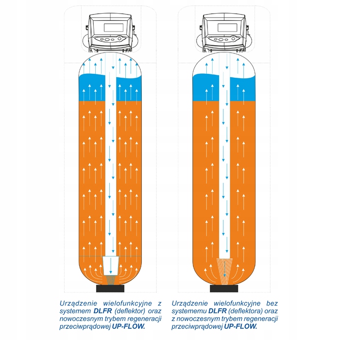 3. ДЕФЛЕКТОР (DFLR): В системе SUPREME-LOGIQ 35K используется современная уникальная система распределения, основанная на работе дефлектора (DFLR). Благодаря В системе DFLR вода течет по всей поверхности слоя, повышая эффективность умягчения воды и равномерное использование всей ионообменной смолы. Сочетание (DLFC) дефлекторной технологии, системы противоточной регенерации UP-FLOW, возможности работы в экономичном режиме "переменной резервной функции" , позволяет реально снизить расход воды в цикле регенерации, снизить выбросы в обратную промывку, снизить расход соли и даже использовать отстой, что приводит к увеличению срока его службы.