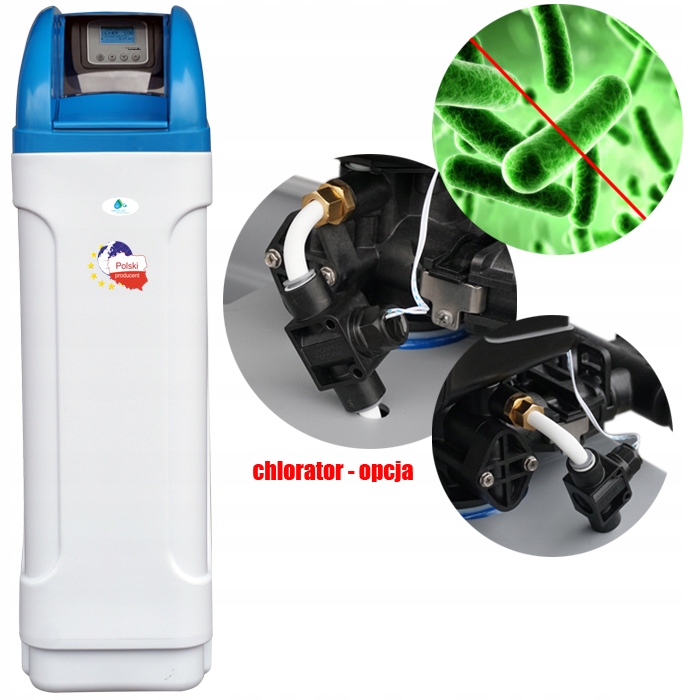 головка управления изготовлена из нержавеющих элементов, она устойчива к УФ -радиации . Контроллер заканчивает пользователем, дружелюбно, содержит меню в польском языке и очень легко программировать. Благодаря этому соленый резервуар во время нормальной работы устройства содержит минимальное количество воды. Благодаря этому решению было устранено влияние образования мостов и отложений соли, и риск роста бактерий был устранен.