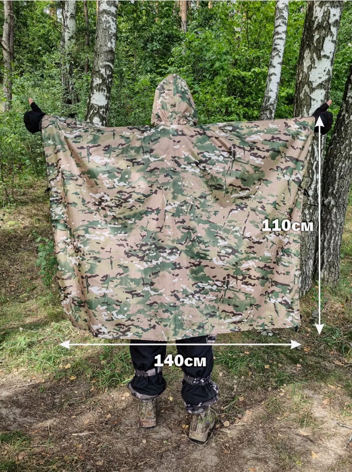 Пошив пончо обеспечивает легкий доступ к карманам, завязкам, фиксирующим края изделия, позволяет использовать макинтош под тактическую одежду, ветровку или куртку. Отличный походный вариант для прогулок на природе, походов, страйкбола.
