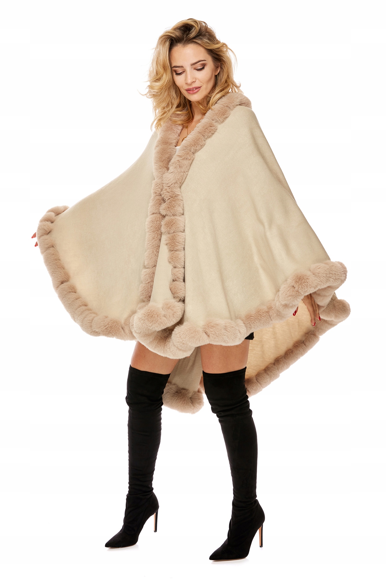 Края пончо с отделкой искусственным мехом.