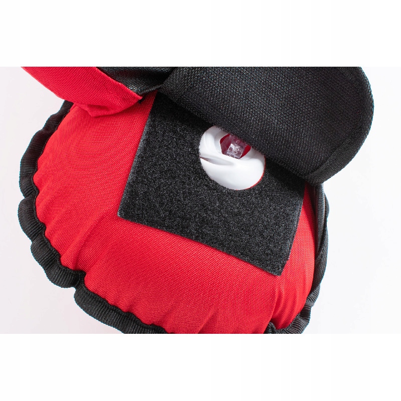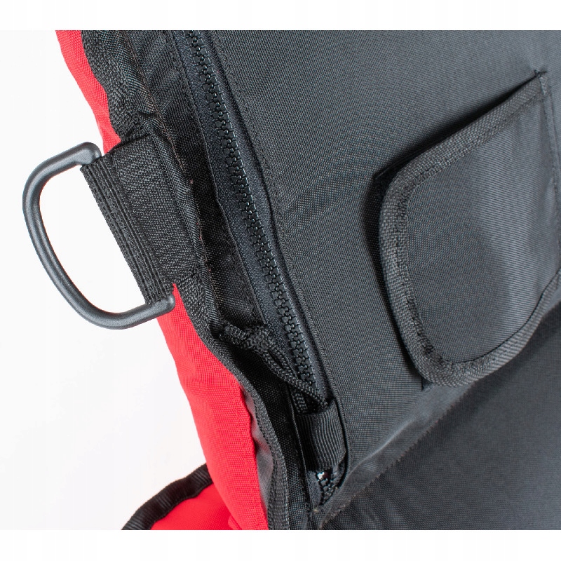 - Изготовлен из полиэстера 420 D, красного цвета сверху и черного цвета снизу.