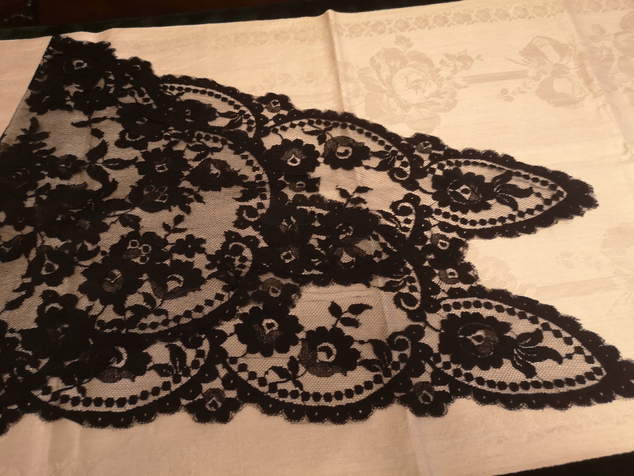 Pre -war Mantle от красивого черного кружева с размерами: 120 см х 46 см, вышиваемая внешность. Ткань сохранилась в довольно хорошем / хорошем состоянии; На окраине и небольших недостатках в тюле будут небольшие выдержки (продукт полностью показан на снимках). Я приглашаю вас на аукцион и на другие мои аукционы.