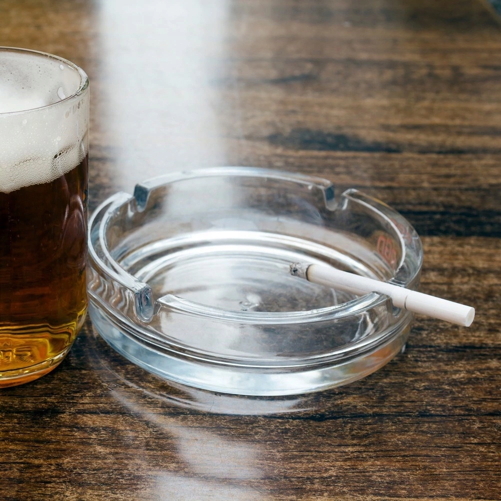 Классическая круглая пепельница из прозрачного стекла. Идеально подходит для использования дома, в саду, в баре и ресторане.