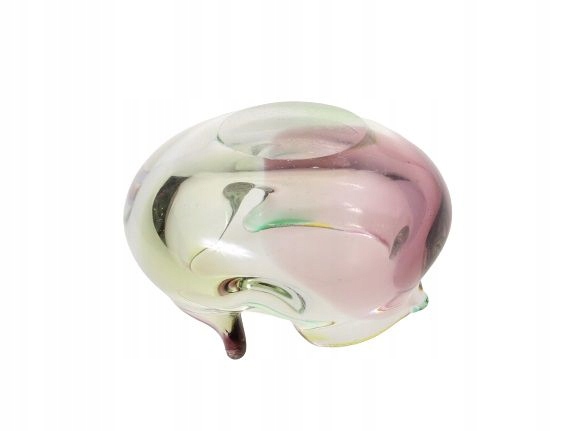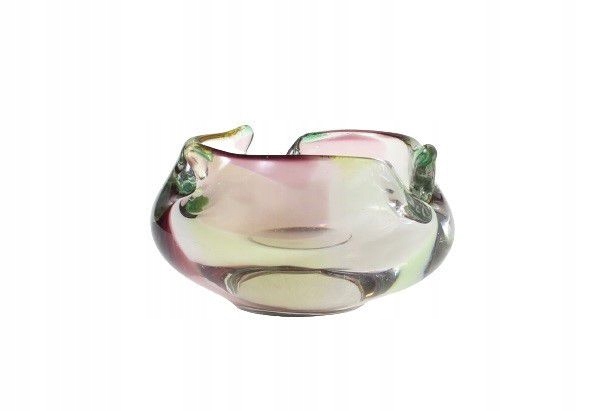 Круглая пепельница на три сигареты, изготовлена из содового стекла ручной формовки. Чаша украшена разноцветными пятнами зеленого, желтого и баклажанового цвета, напоминающими сосуды из серии «Рапсодия», созданные братьями Земек для Мстисовского стекольного завода. Но это другой сериал и, возможно, другая продюсерская компания. Возможно, Новый Бор. Чехословакия, вторая половина XX век