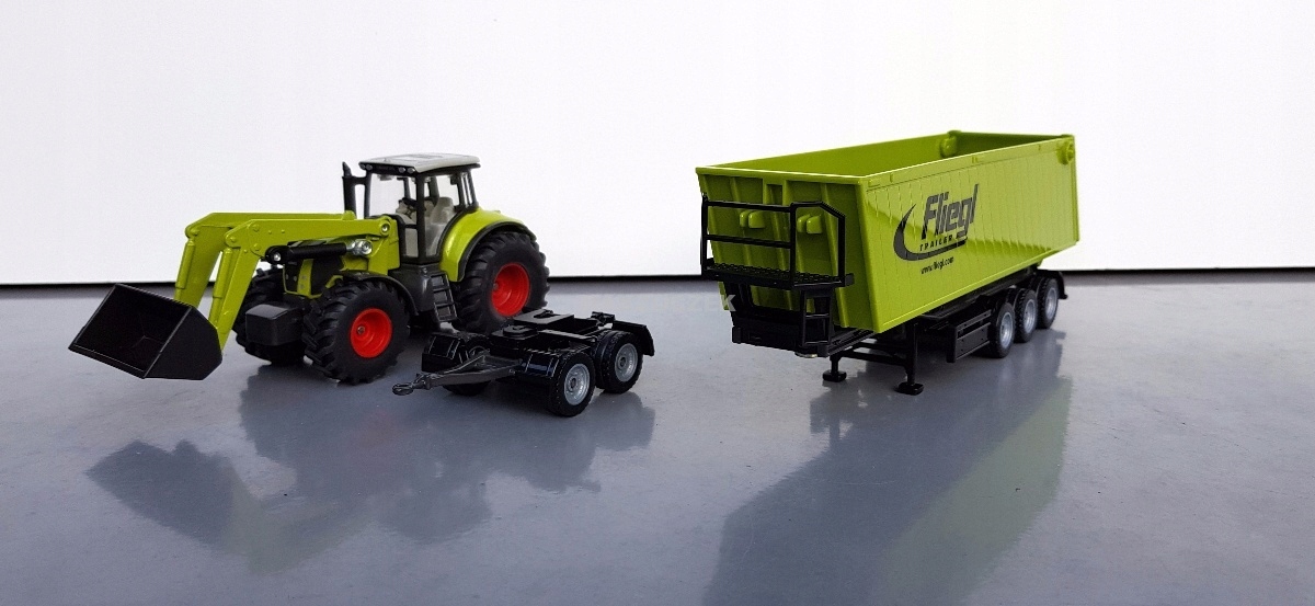 Набор, состоящий из трактора с погрузчиком и самосвала. Трактор Claas Axion 850 с погрузчиком тянет 3-осный самосвал Dolly. Самосвал Dolly можно комбинировать с любыми тракторами серии SIKU. Возможность открыть заднюю дверь. Металлическая модель с пластиковыми элементами. Очень тщательно сделано с вниманием ко всем деталям.