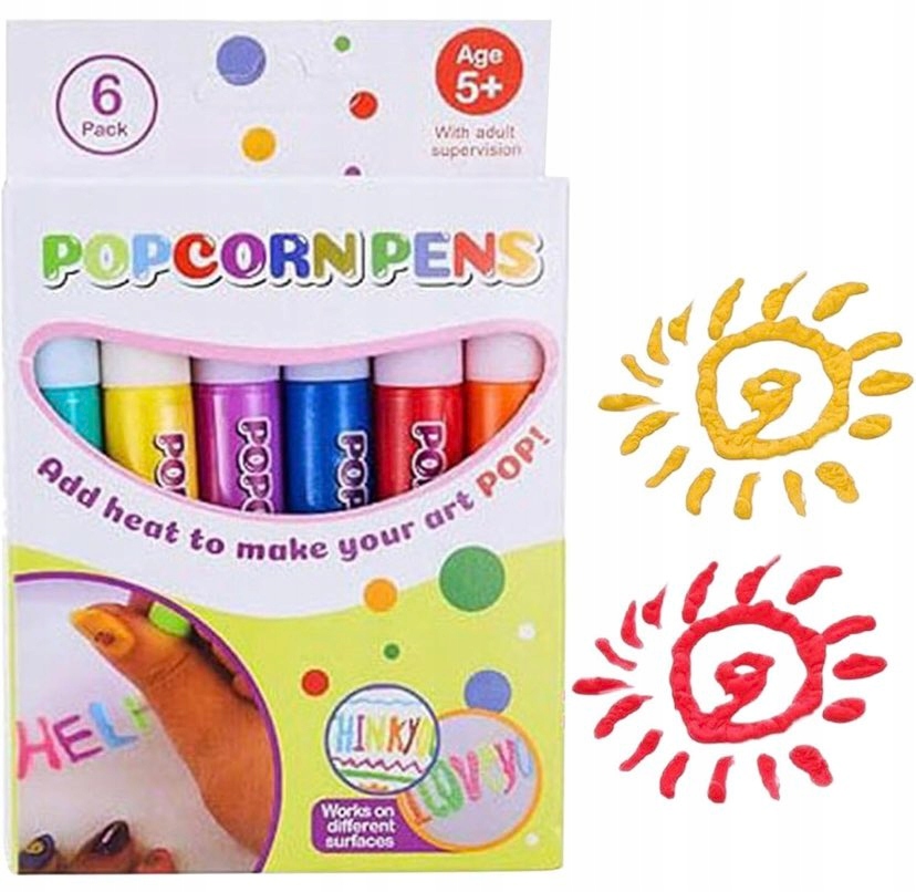 Popcorn Puns - это набор 6 красочных маркеров , которые после нагрева (например, фен) создает трехмерный эффект - тумарная туманина поднимается и получает выпускную текстуру. Это отличный способ развить воображение и художественные способности детей от 5 лет.