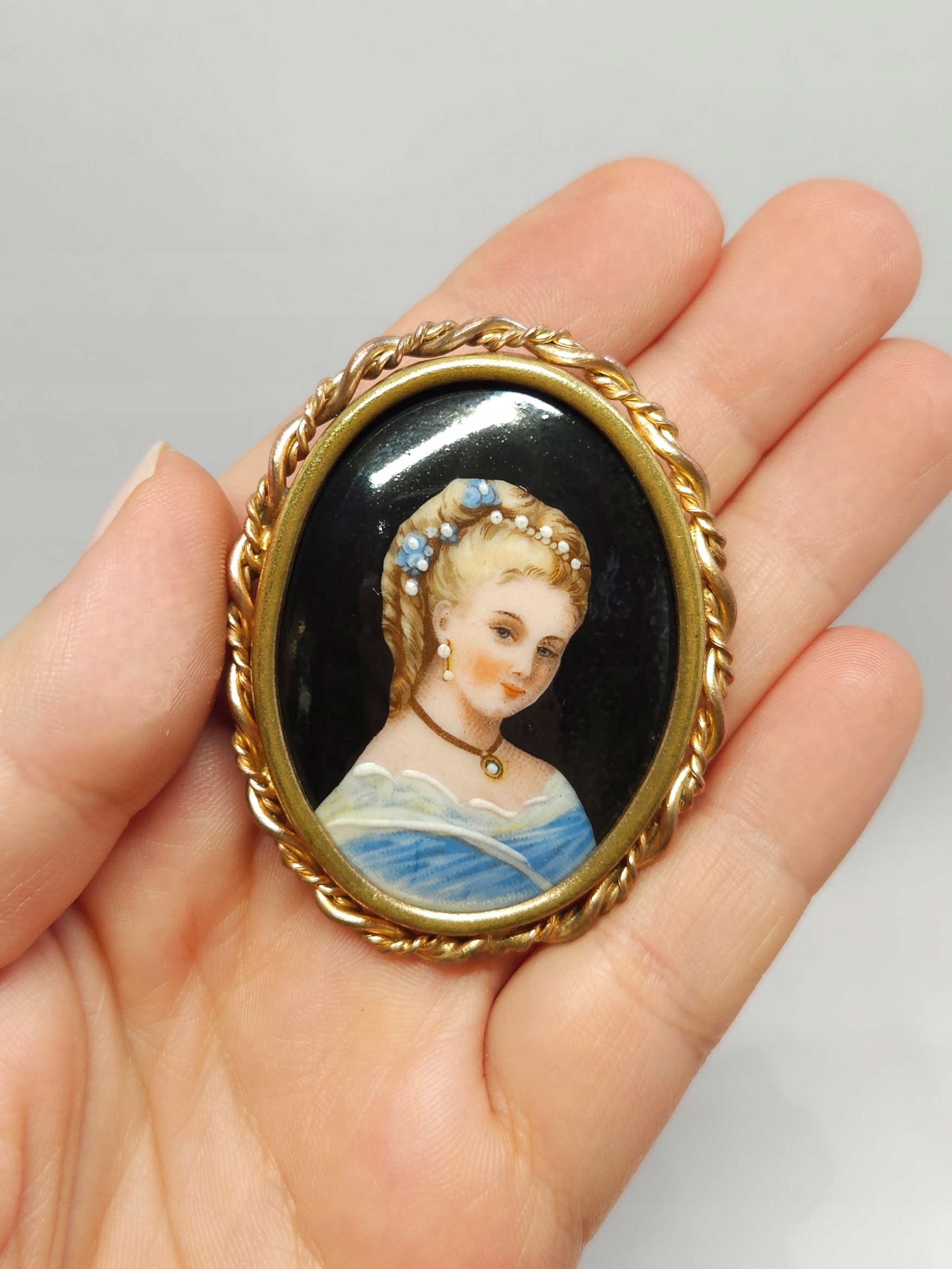 Фарфоровая брошь начала 20 века Лимож, медь, латунь, бюст женщины.