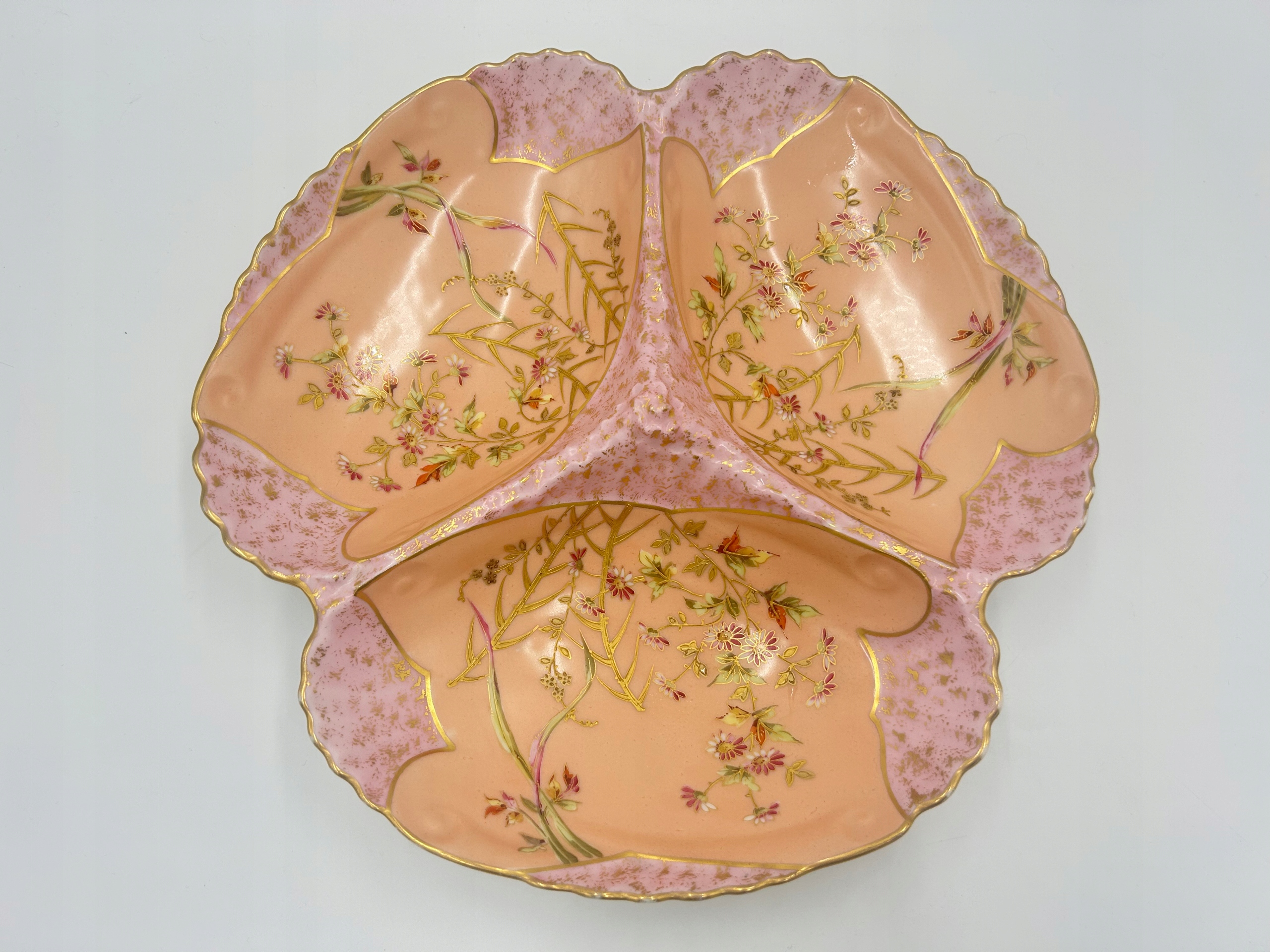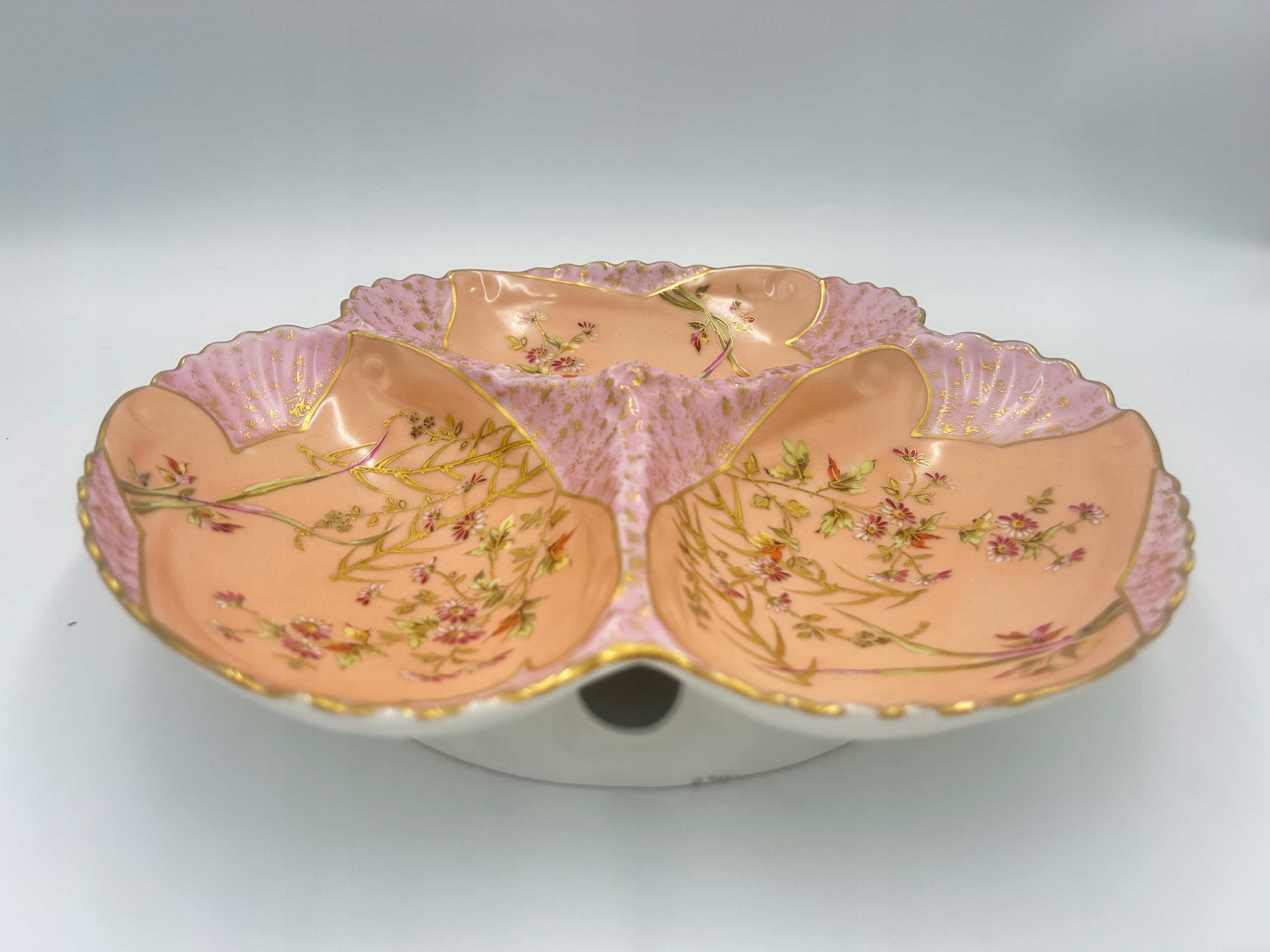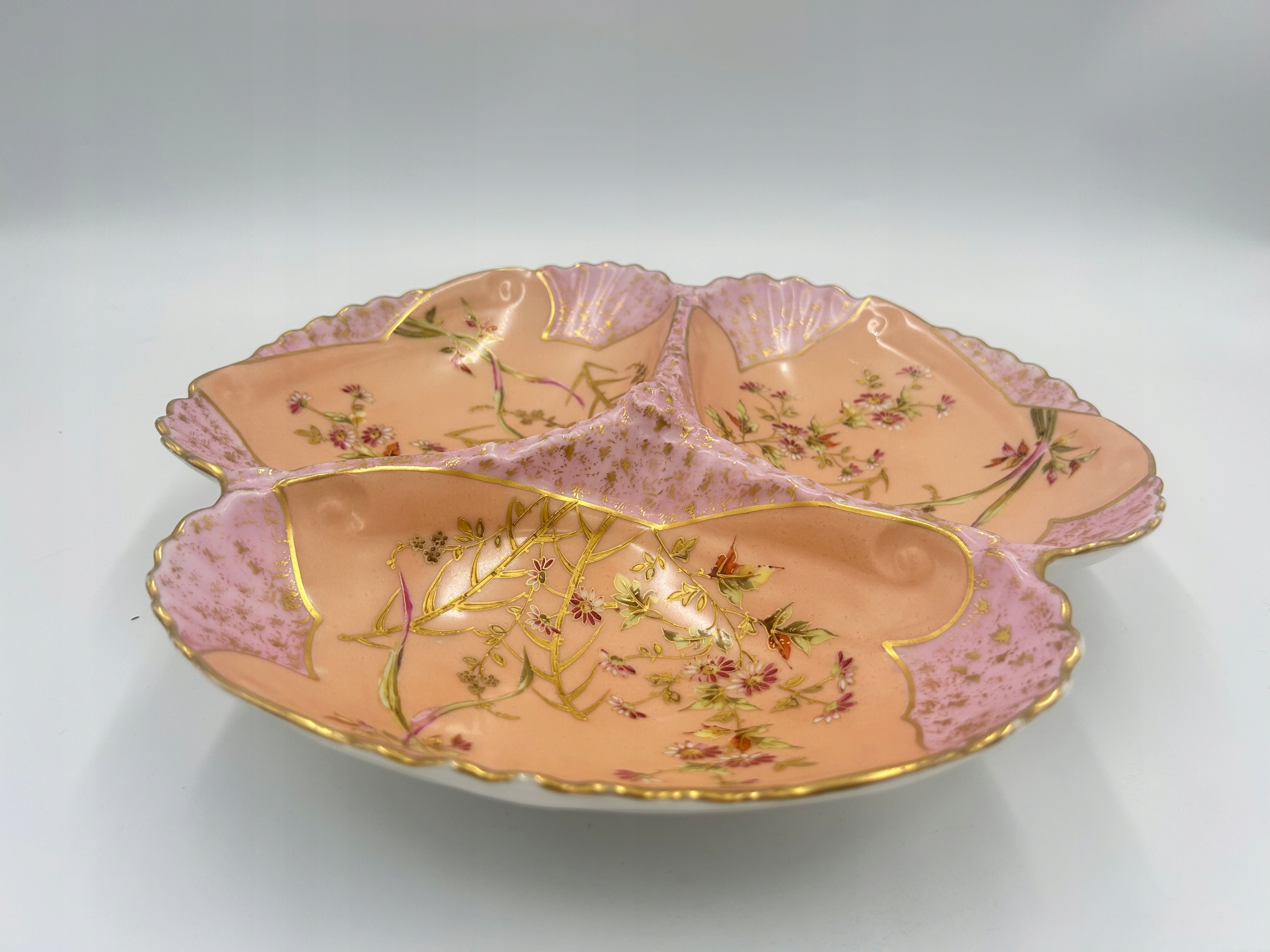 Тема продажи - блюдо с отсеками - кабаре, используемой для подачи стартеров. Изготовлен из фарфора и характеризуется богатым украшением в виде цветочных узоров и золотых акцентов. Волнистые края судна подчеркивают его элегантный характер.