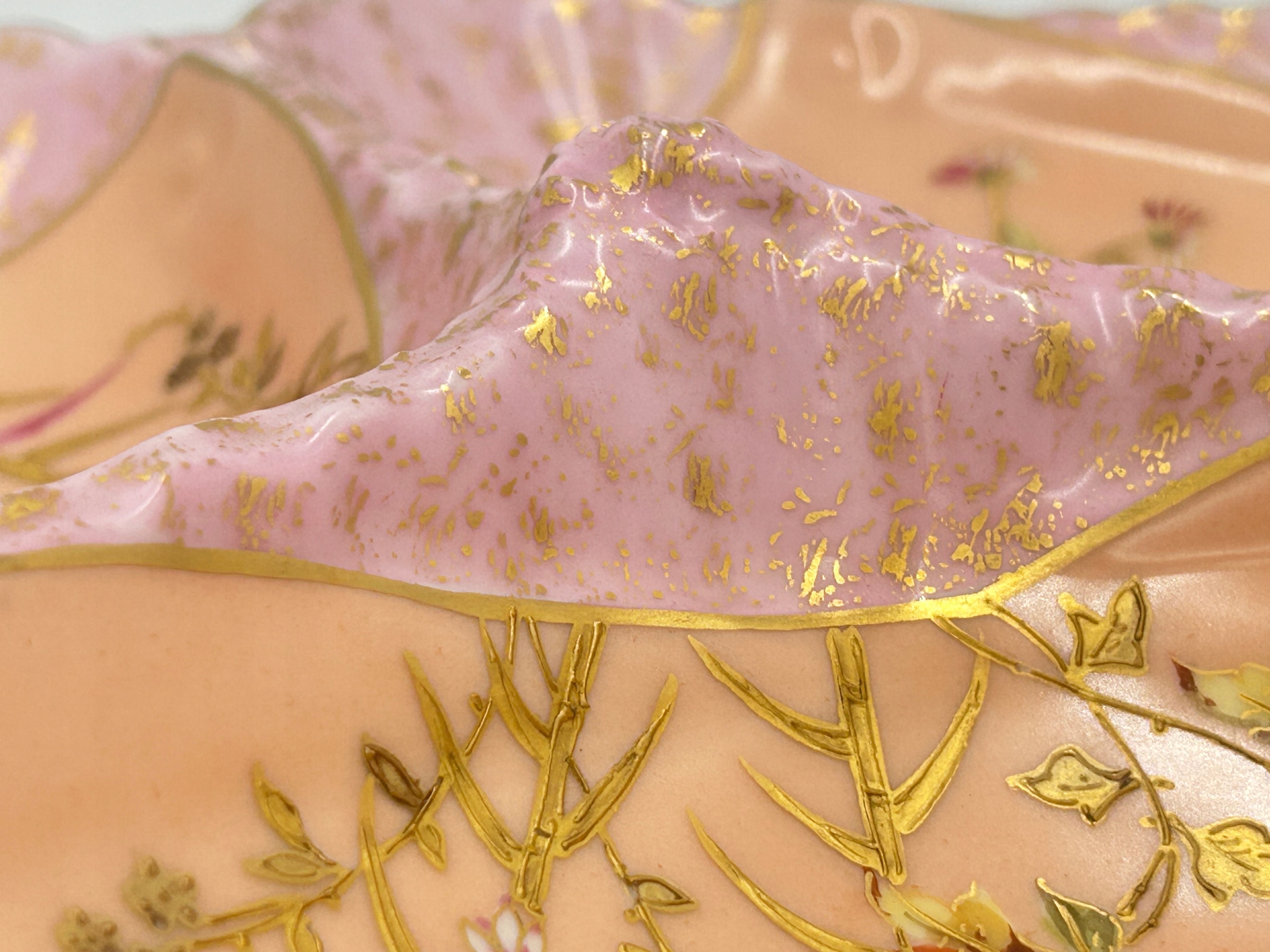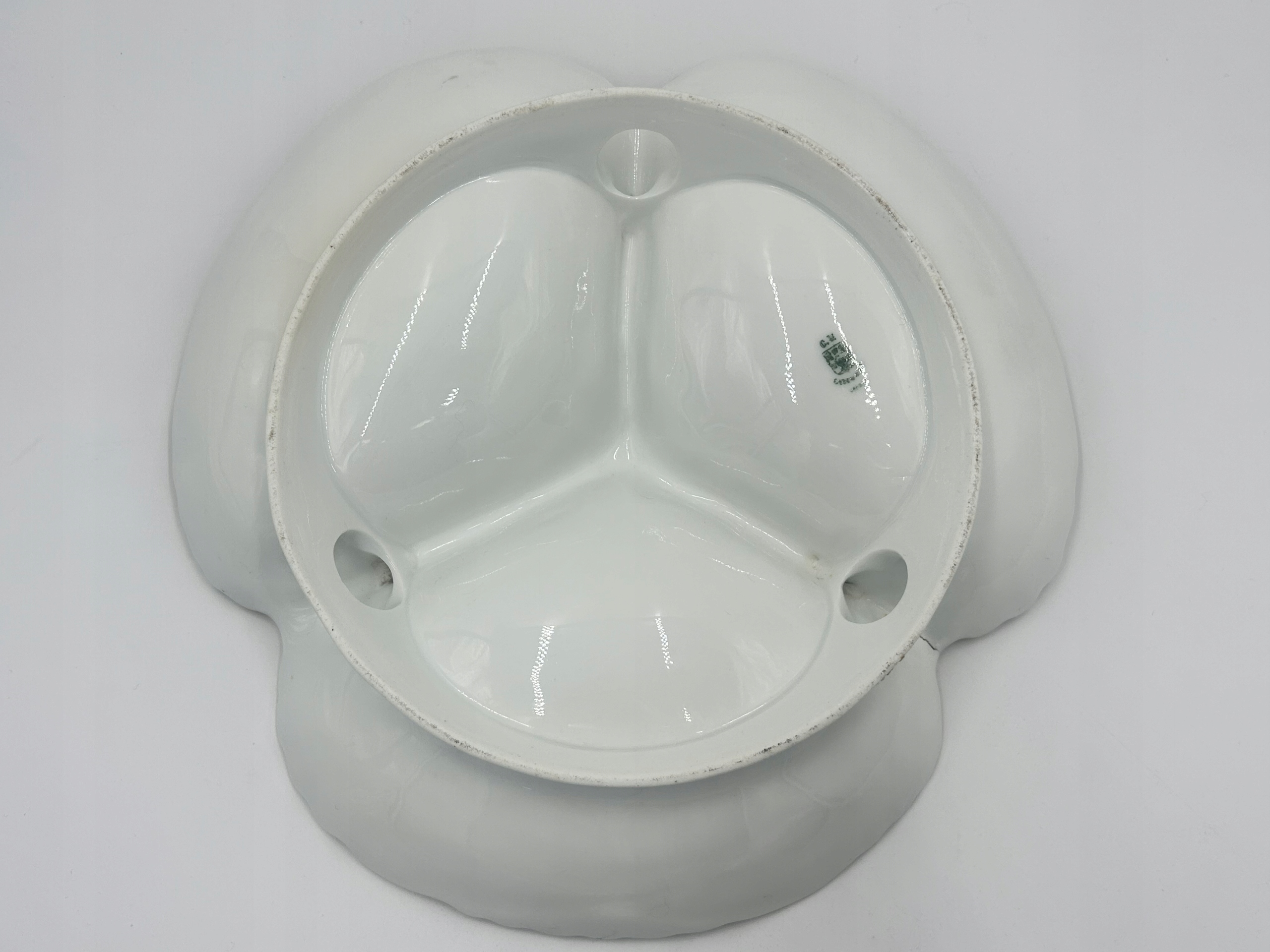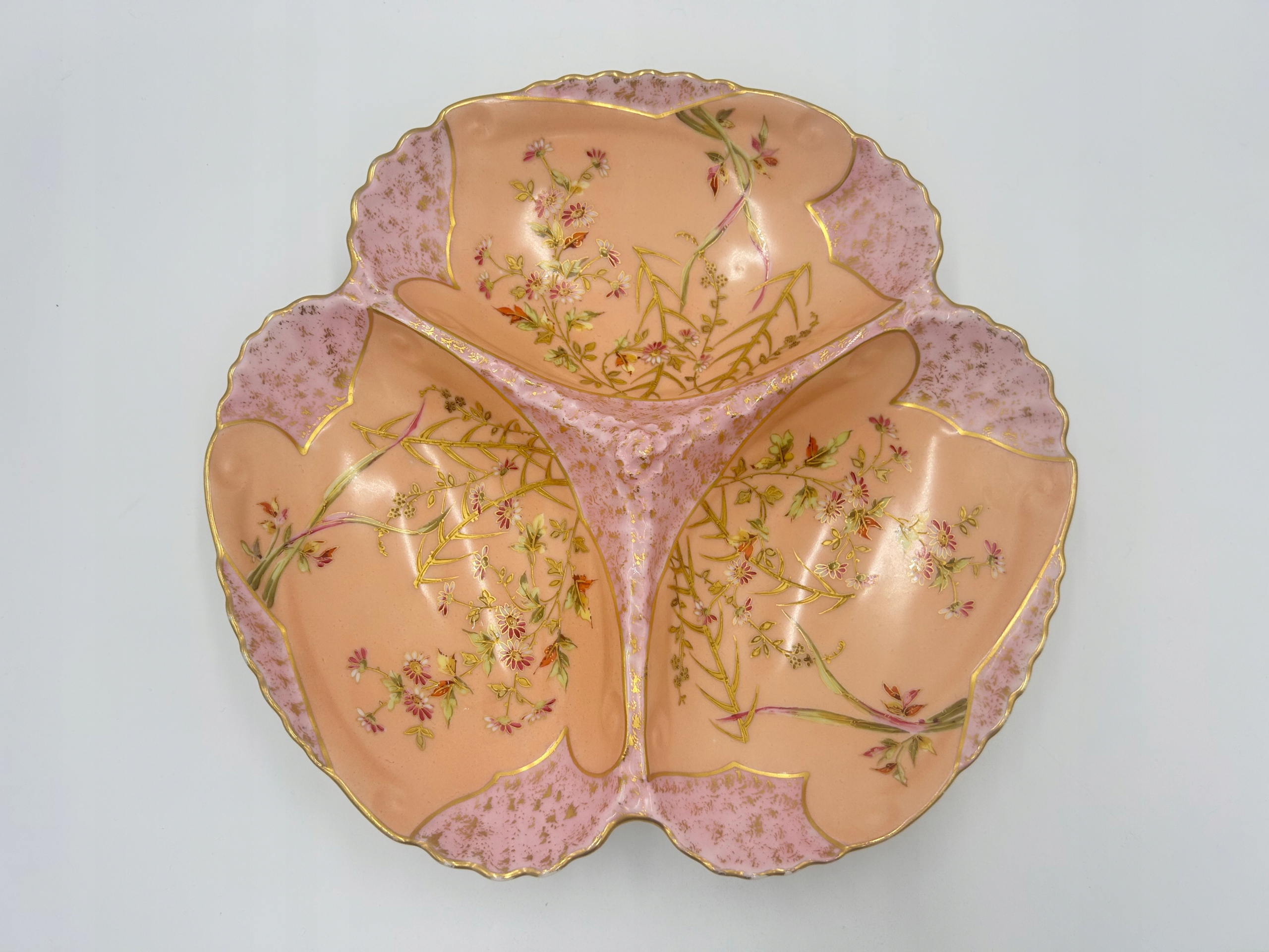 Тема продажи - блюдо с отсеками - кабаре, используемой для подачи стартеров. Изготовлен из фарфора и характеризуется богатым украшением в виде цветочных узоров и золотых акцентов. Волнистые края судна подчеркивают его элегантный характер.