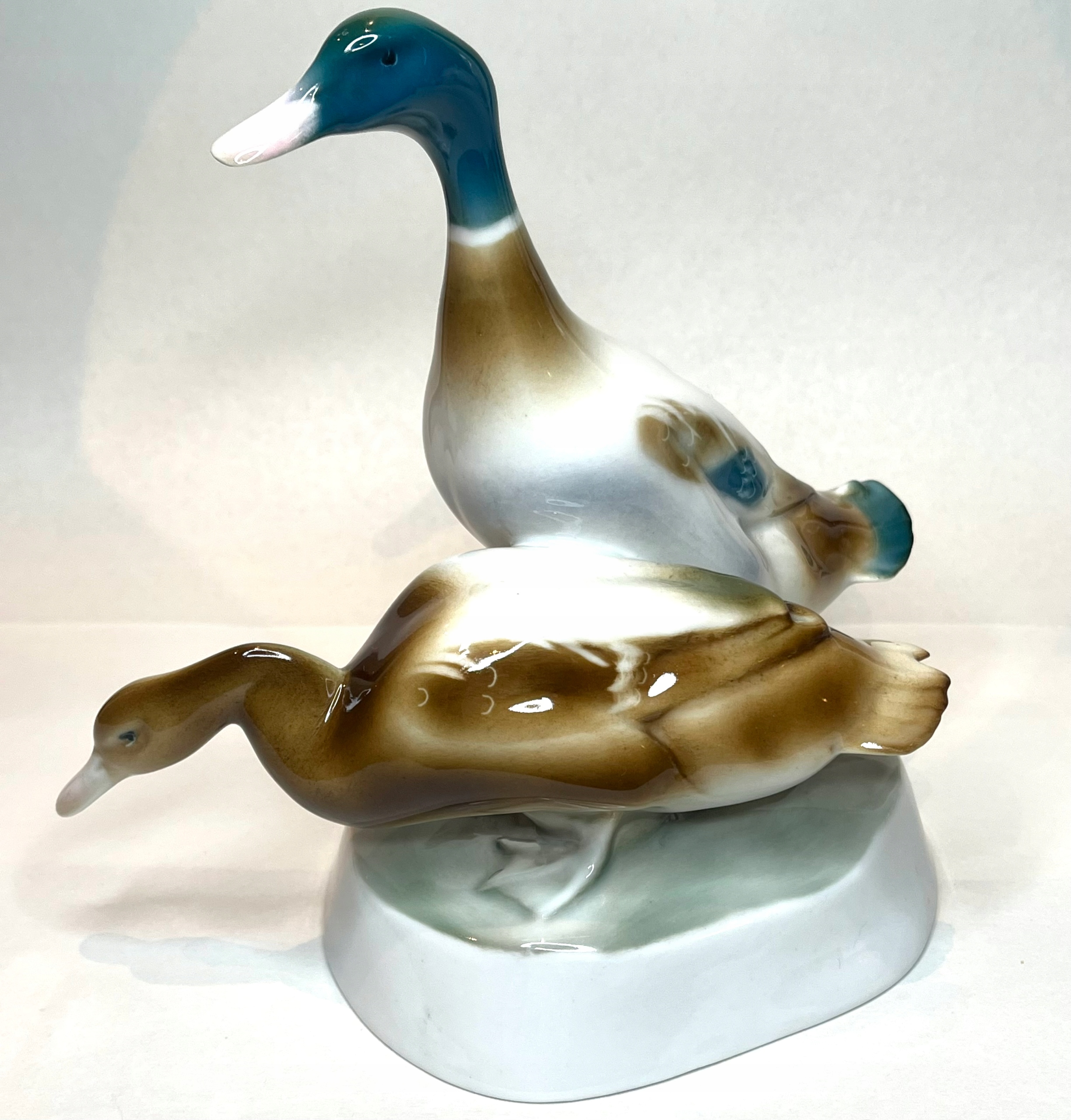 фарфоровой фигурки с изображением двух уток, сделанной известной Zsolnay Manufaktura из Венгрии. Композиция впечатляет с естественностью формы и тонких цветов. Ручная живопись добавляет уникального персонажа и делает его уникальным украшением для коллекционера.