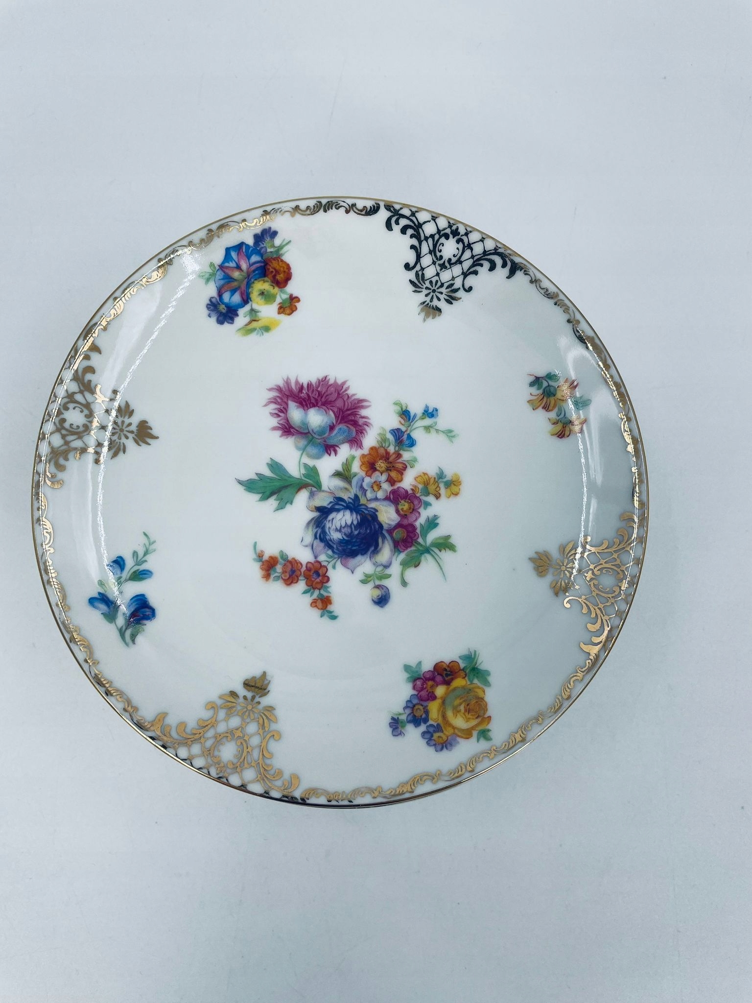 фарфоровая пластина Kpm Krister в белом с цветочным рисунком и золотым рисунком на рейтинге.