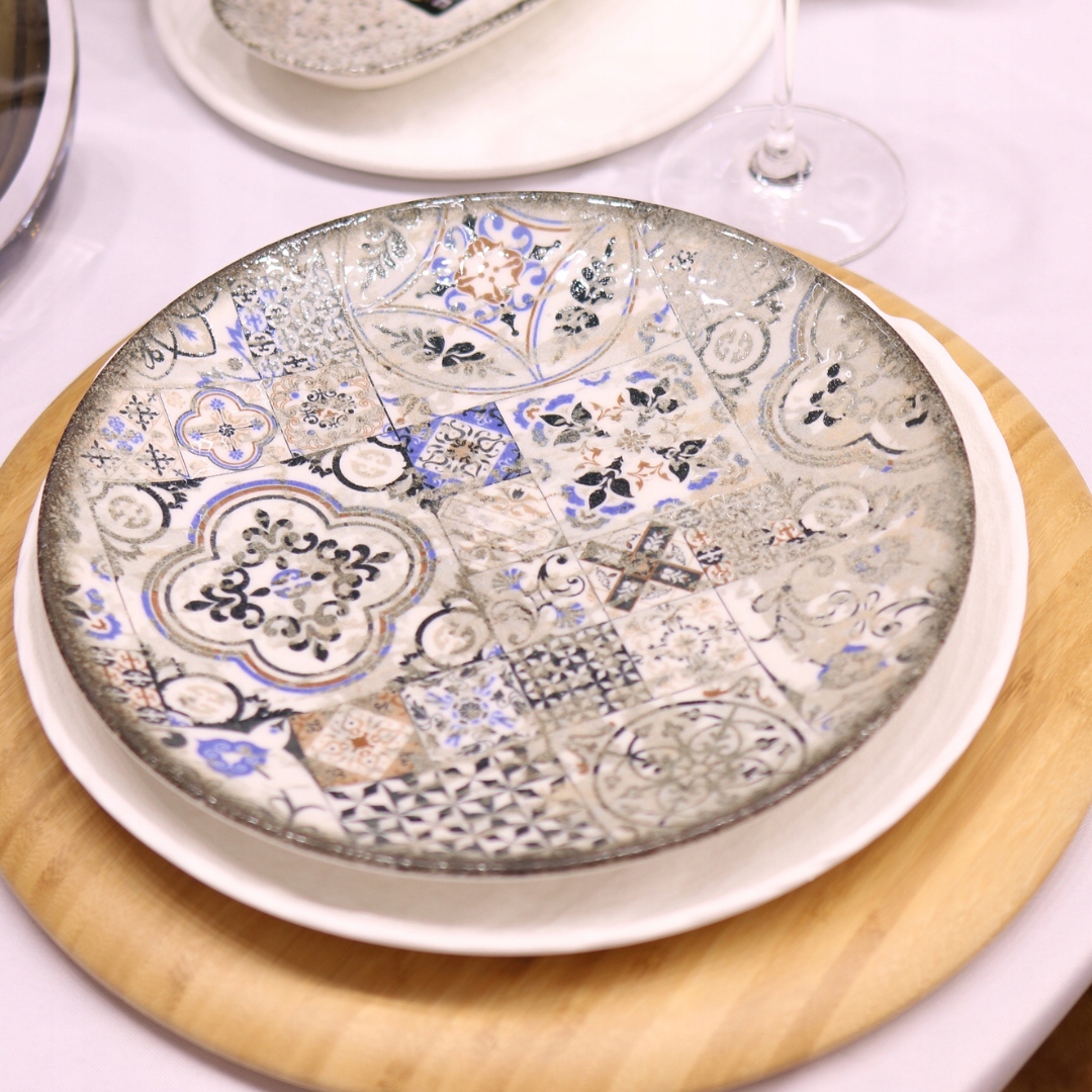 винтажный обеденный залог Винтажные любители стиля. Орнамент вдохновлен традиционным португальским искусством Азулехо - это символ португальской архитектуры. Окрашенные керамические плитки с узнаваемыми узорами особенно популярны в Лиссабоне.