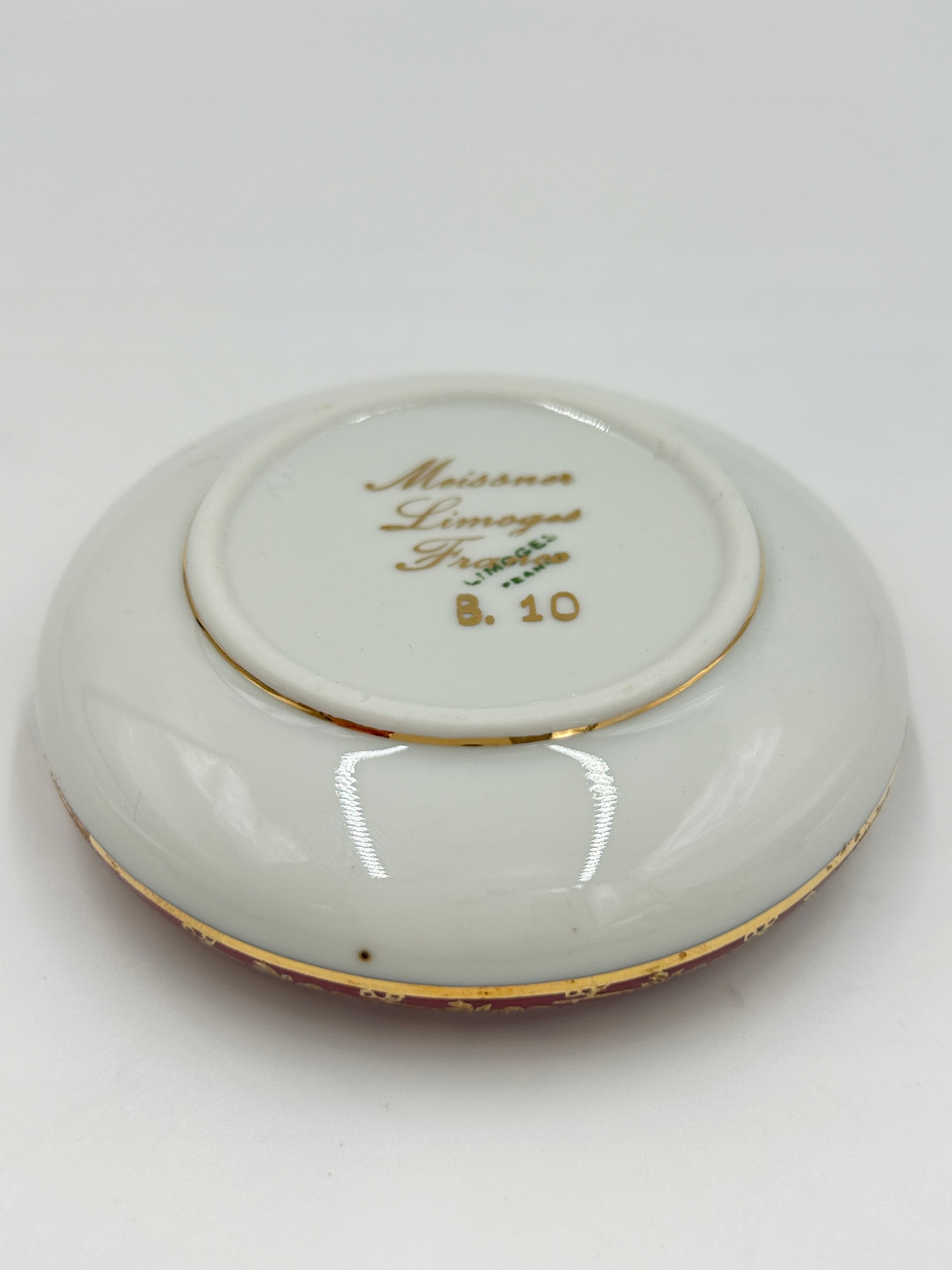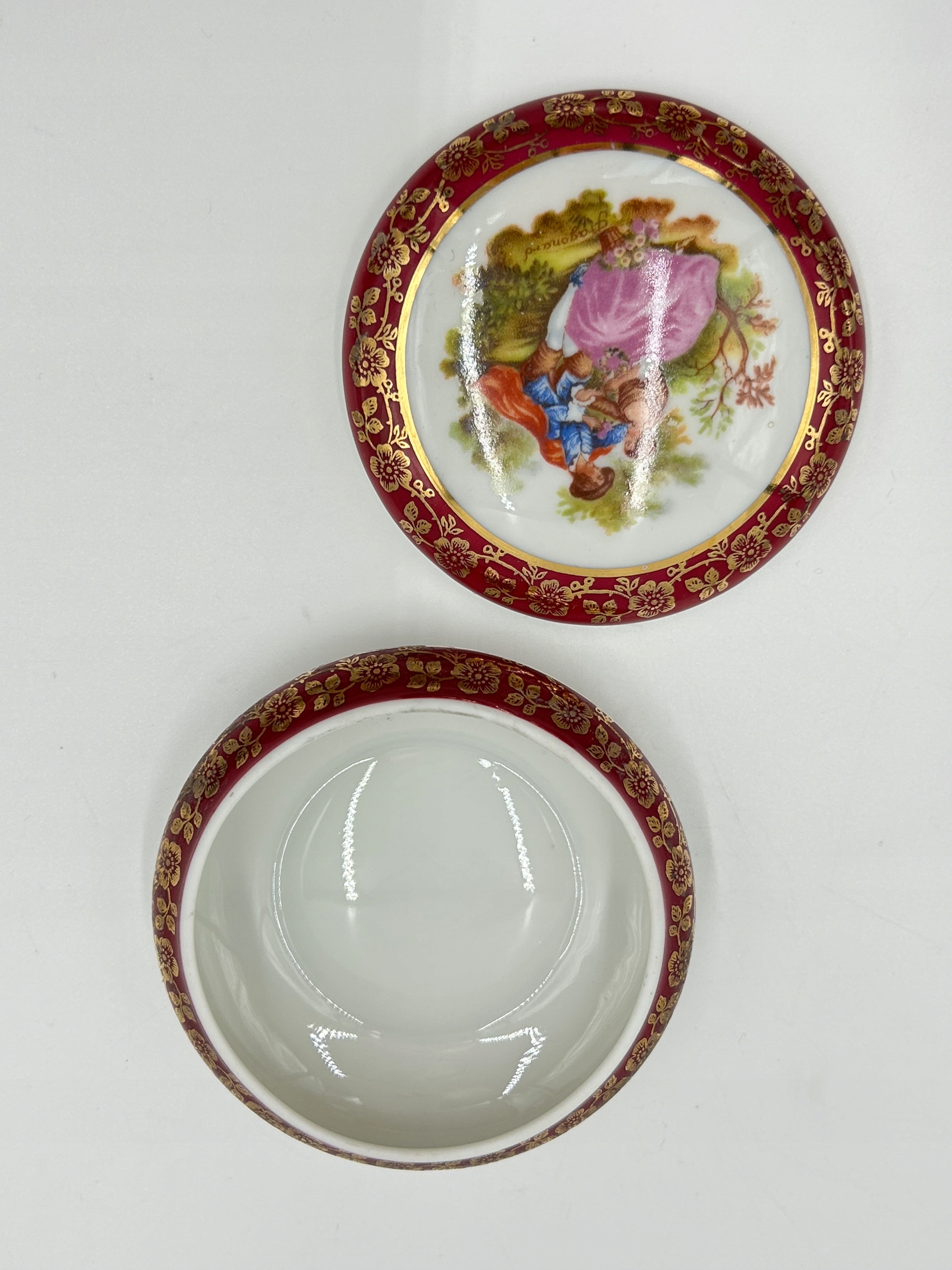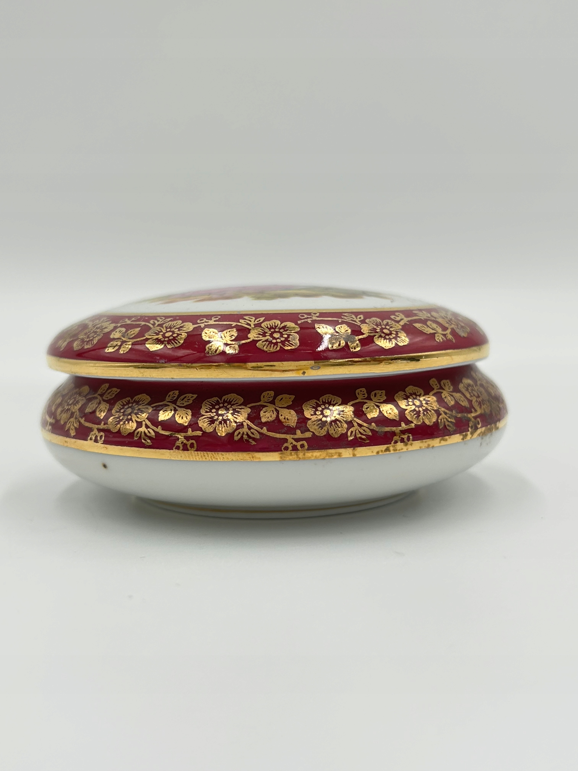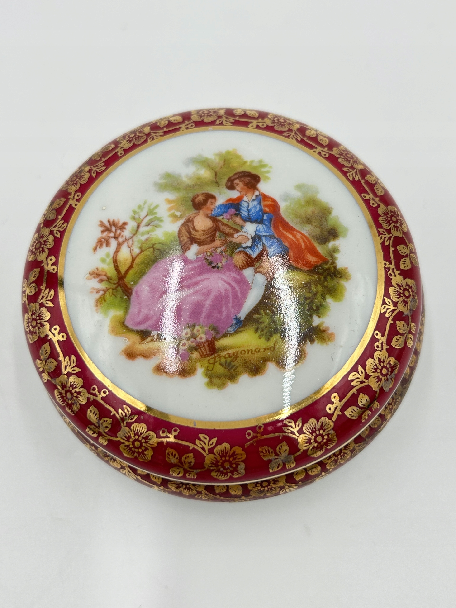 Тема продажи - красивая шкатулка из фарфоровых лимож. Изготовлен из высококачественного фарфора, украшенный сценой и золотыми цветочными украшениями, доминирующим цветом. Украшен с большой точностью и поведением деталей. Уникальный декоративный предмет для людей, которые ценят элегантность, идеально подходят для подарочного подарка для любимого человека или обогатить полку коллекционера.