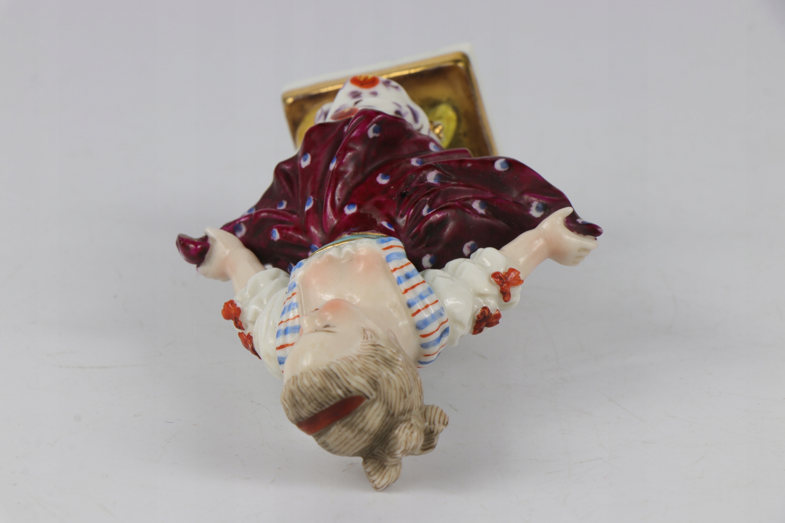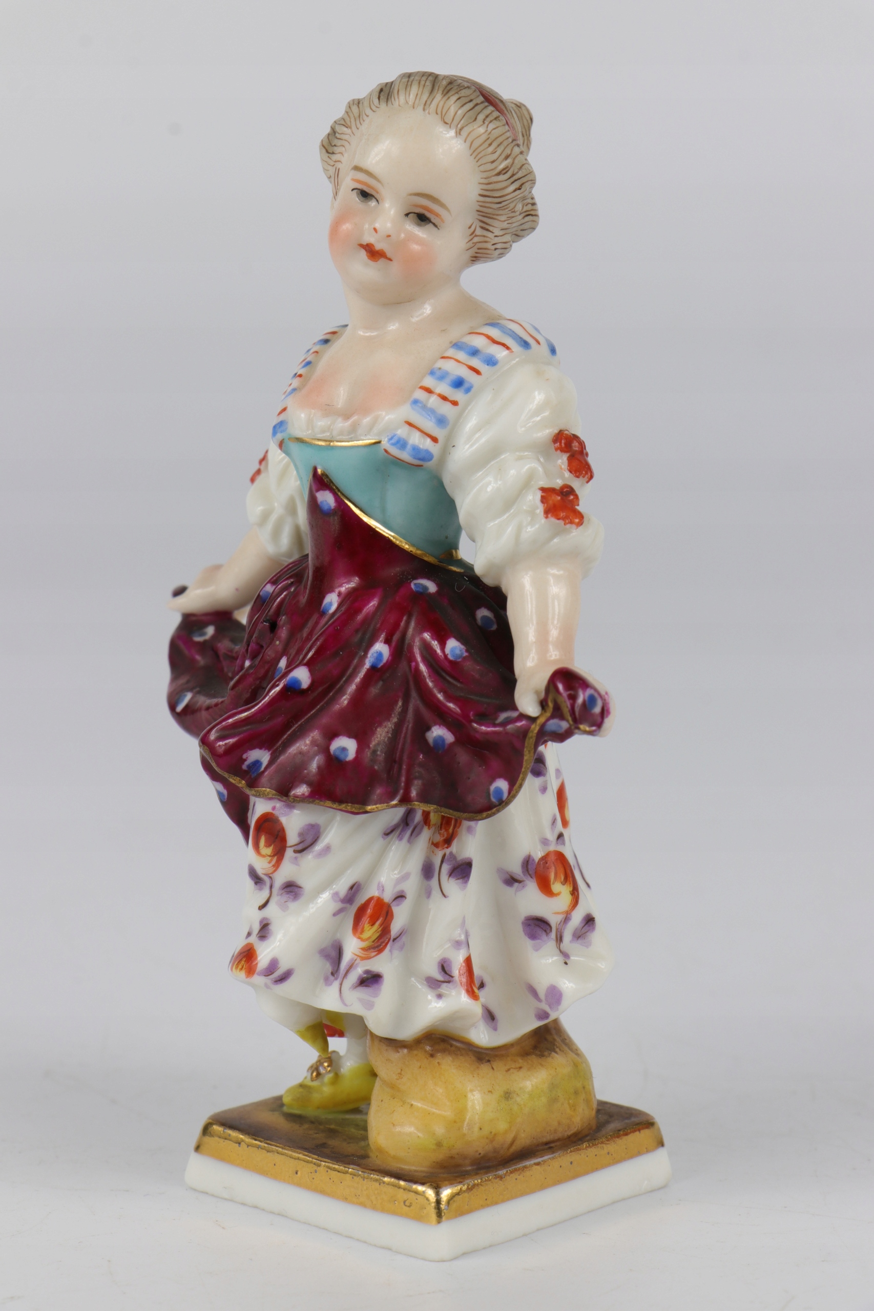 Интересная, очень старая фарфоровая статуэтка конца 18 - начала 19 века. Статуэтка с характерным старинным квадратным основанием без внешнего края. Фарфоровая статуэтка внутри полноценная, а не пустая. Фарфор с ручной росписью: девушка с оранжевыми щеками, типичная для стиля рококо. Несмотря на повреждения, очень интересная статуэтка.