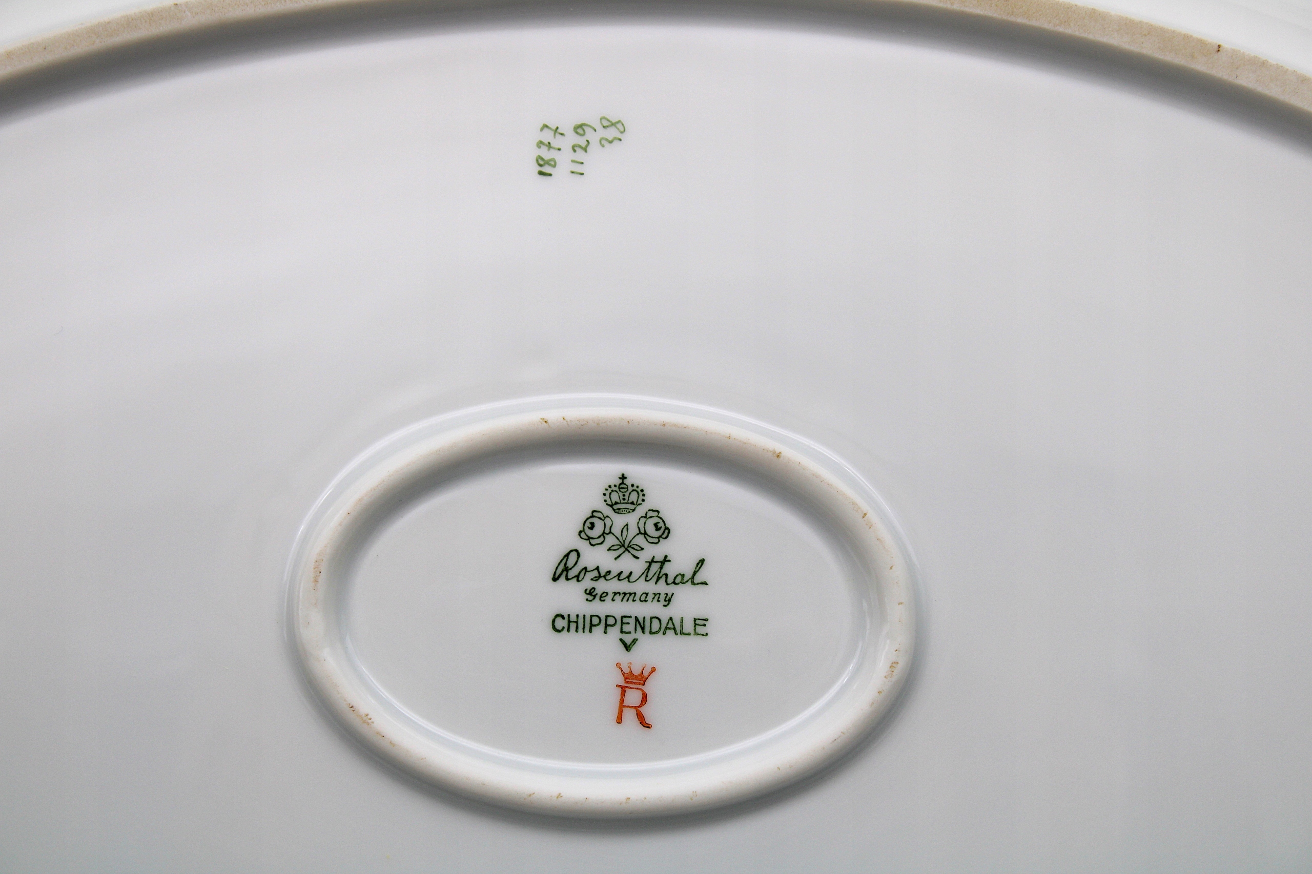 РЕКОМЕНДУЮ ТАРЕЛКУ, МОДЕЛЬ ЧИППЕНДЕЙЛ, ИЗ ФАРФОРОВОГО ЗАВОДА РОЗЕНТАЛЬ В БАНЕХОФЕ/ЗЕЛЬБЕ - БАВАРИЯ, ИЗГОТОВЛЕНИЕ В 1930-Х ГОДАХ, СОСТОЯНИЕ ТАКОЕ КАК НА СКАНИРОВАНИИ, ИМЕЕТ ЕСТЕСТВЕННЫЕ ВРЕМЕННЫЕ ИЗНОСЫ НА ЗОЛОТОМ ПОКРЫТИИ