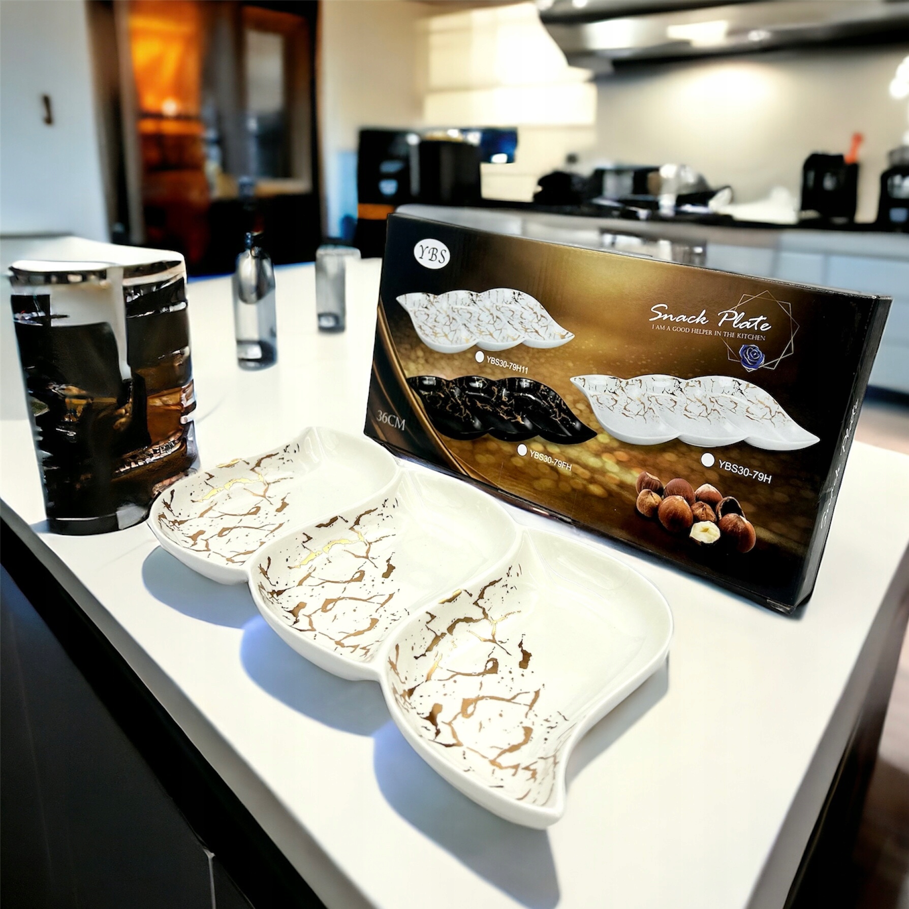 Украшен золотыми акцентами. > Это блюдо излучает роскошь и изысканность, добавляя благородства каждому столу. Его трехчастная конструкция позволяет элегантно подавать различные закуски, фрукты и сладости, создавая неповторимую атмосферу для любого случая.