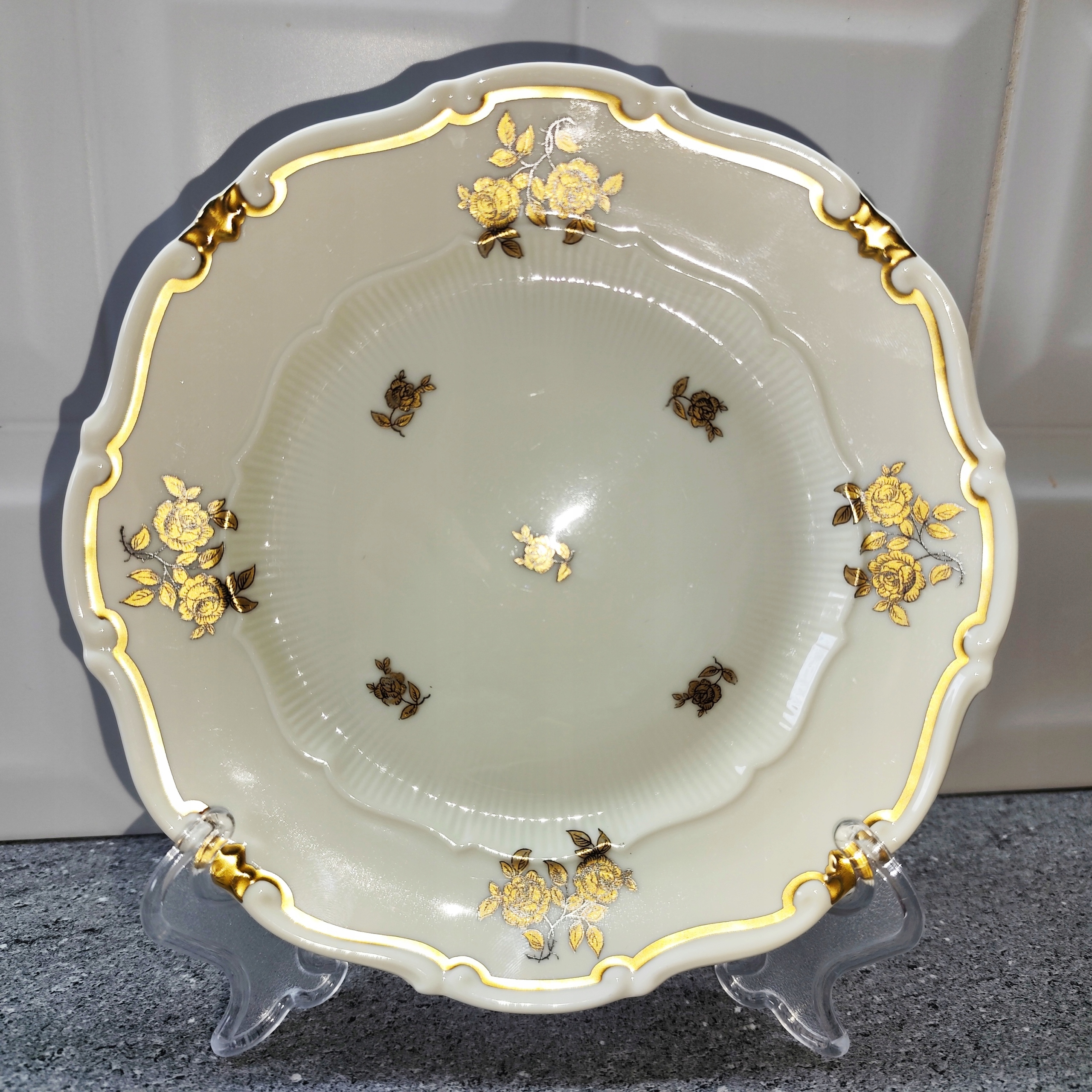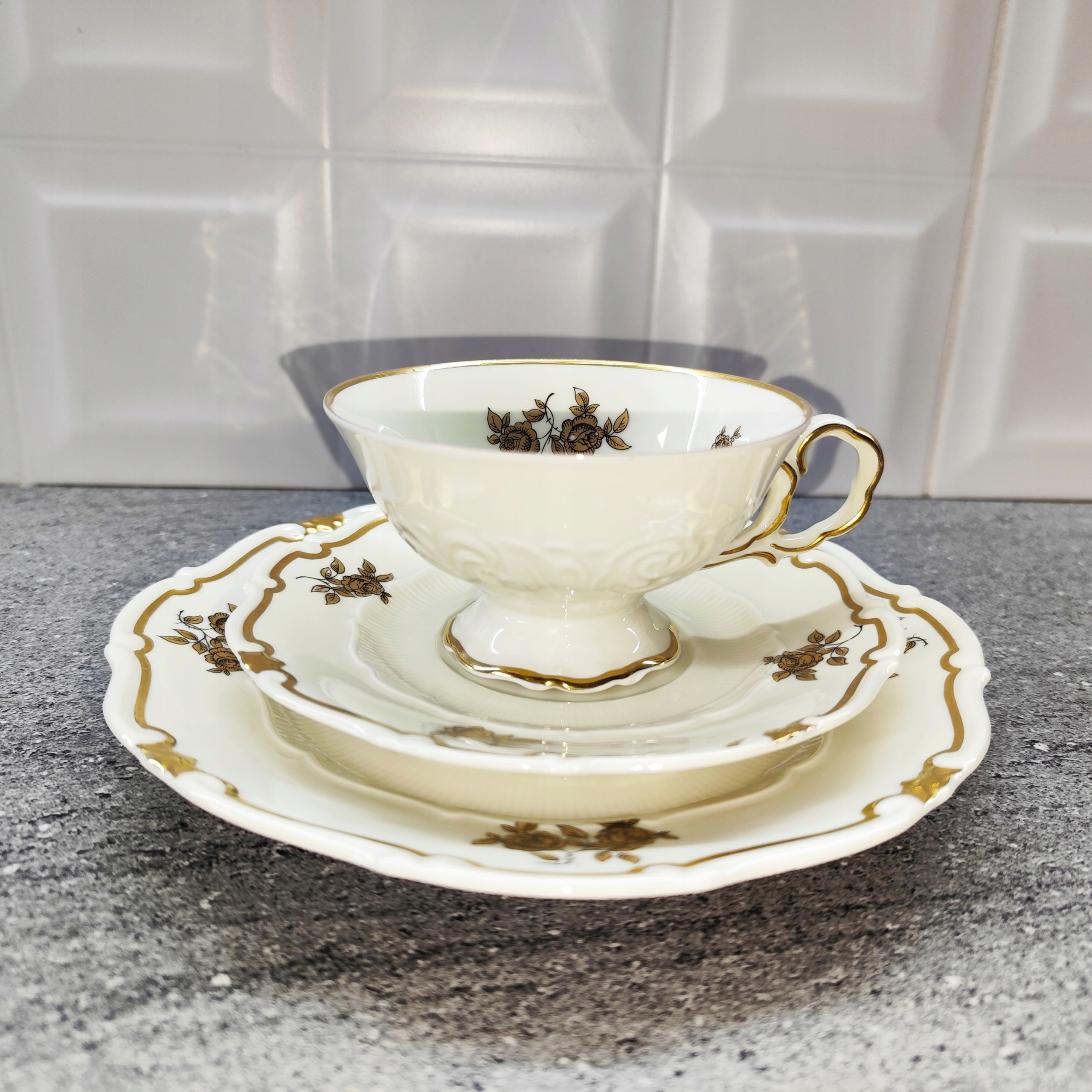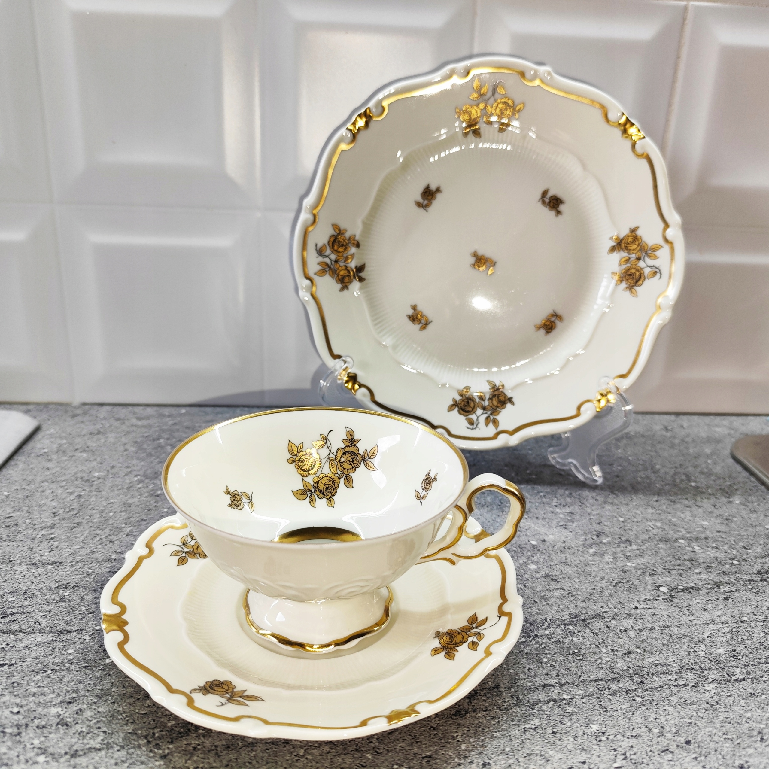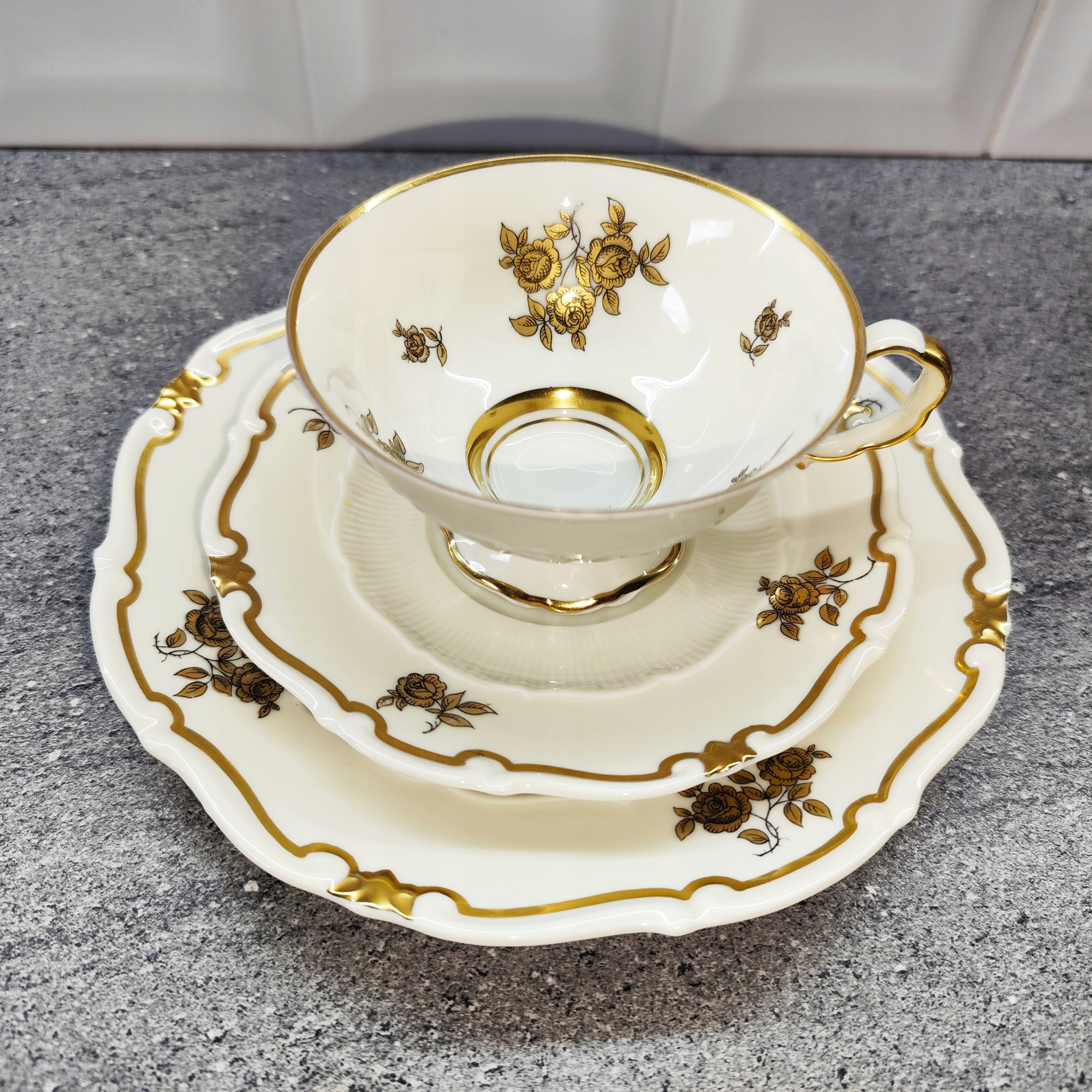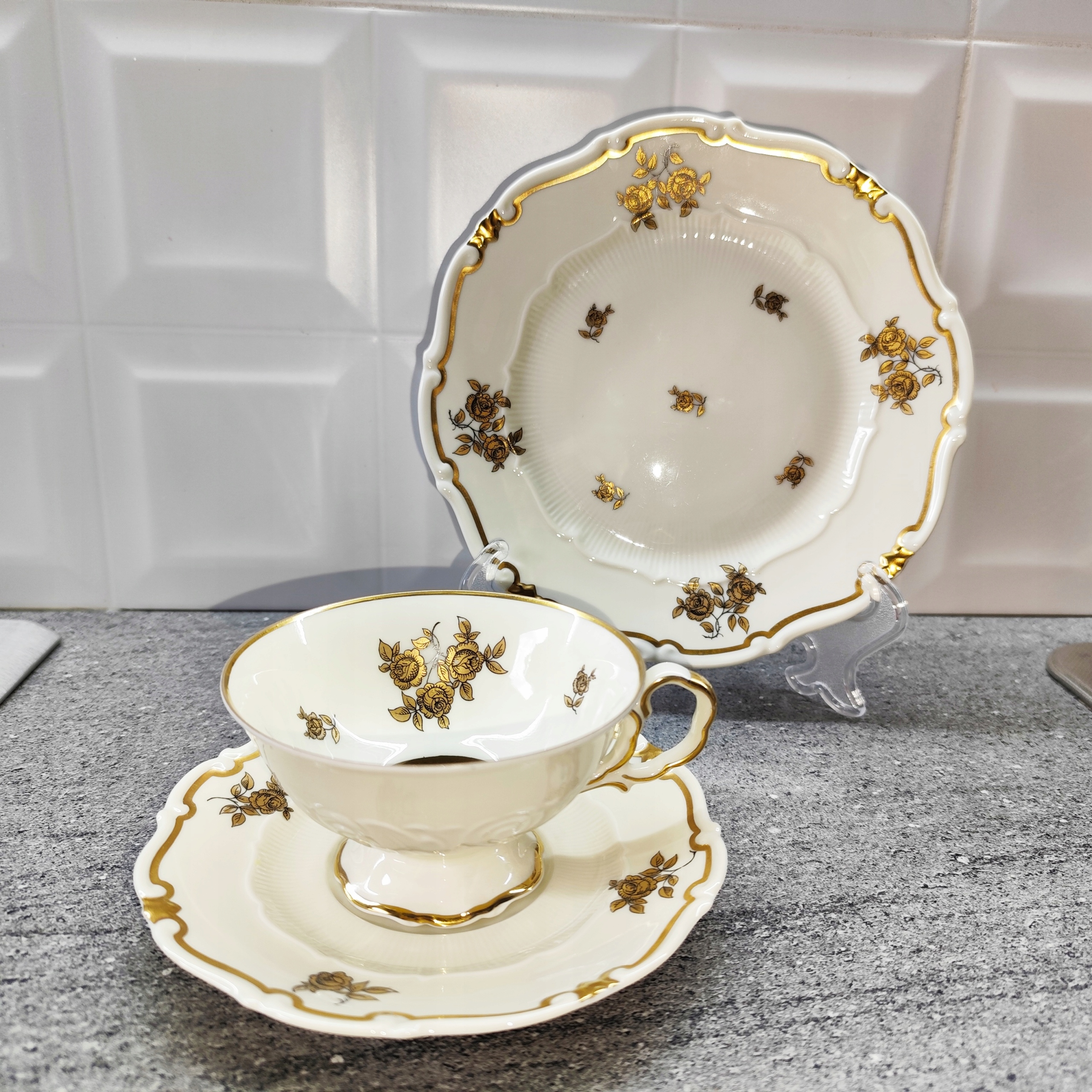 Фарфоровое трио, золотые цветы, фарфоровая чашка, подпись Веймара.