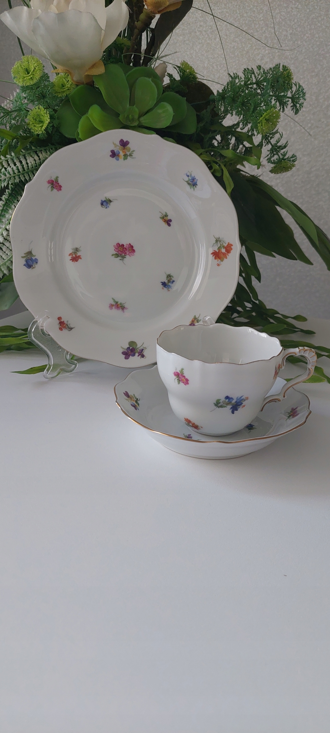 Трио Линдера с высотой размеров чашки 6 см, диаметр 8,5 см. Диаметр пластины под чашкой 14 см, диаметр десертной пластины 19,5 см. Десертная пластина имеет небольшие царапины, видимые на картинках, кроме того, очень хорошее состояние.