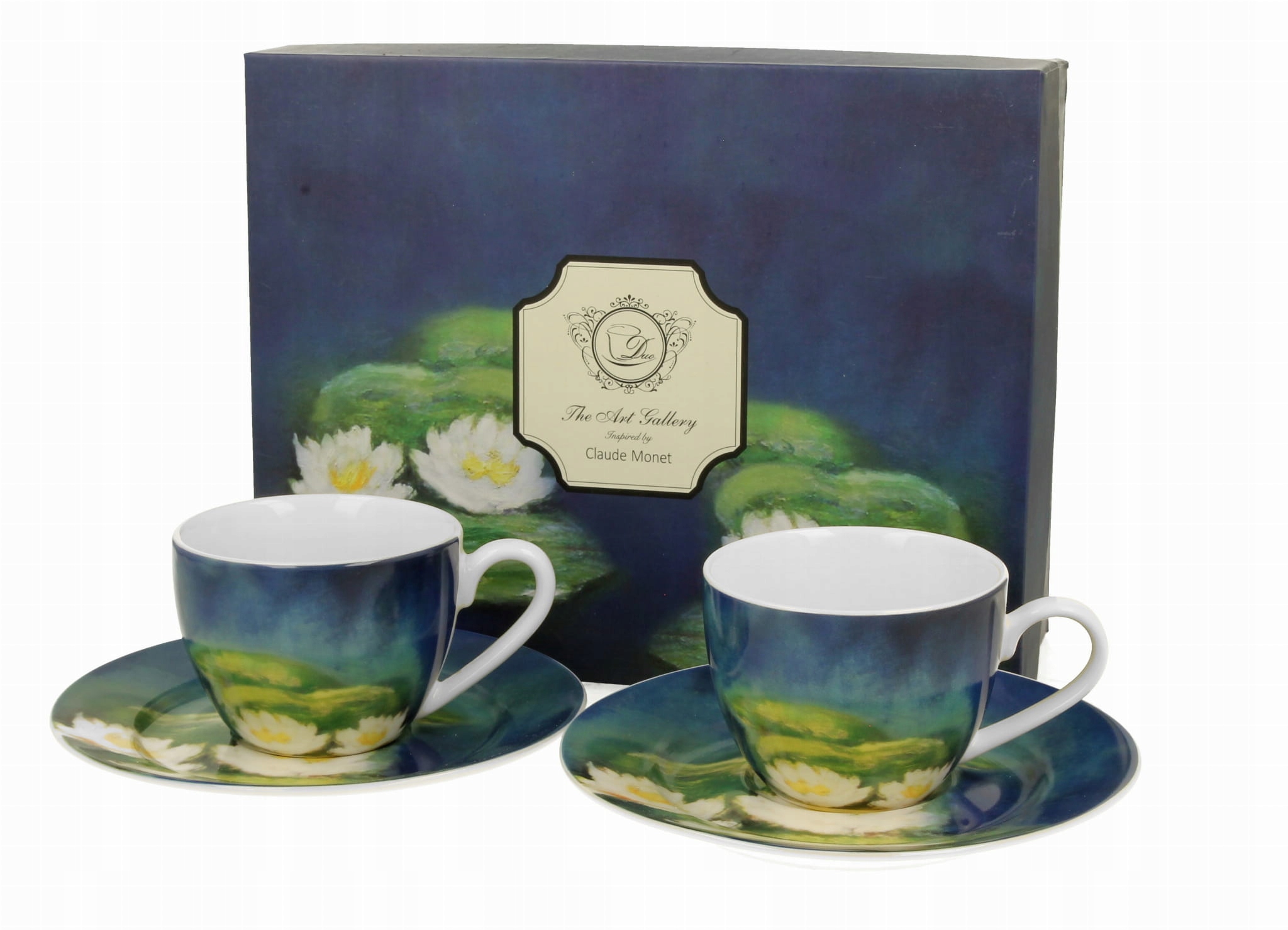 Внутренняя часть чашек украшена фрагментом репродукции картины «Кувшинки», где нежные белые кувшинки на выразительном темно-синем фоне создают неповторимую композицию.