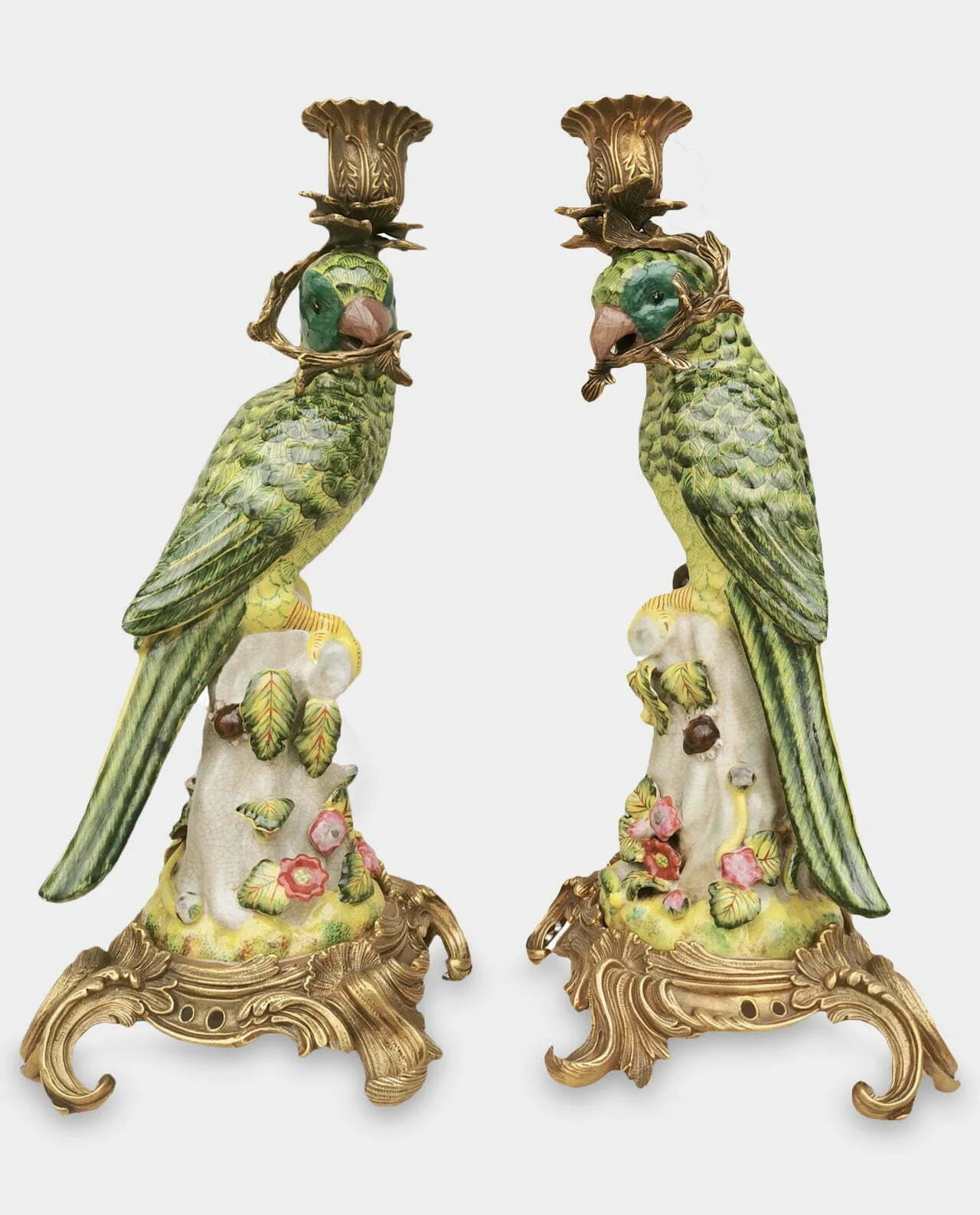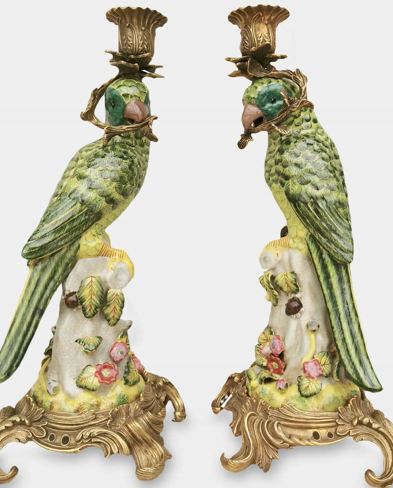 Уникальный набор из двух фарфоровых подсвечников в форме попугаев. Красивые, реалистично нарисованные зеленые попугаи сидят на пнях. Изготовлен из эксклюзивных материалов - фарфора и бронзы, очень точно, с вниманием к мельчайшим деталям. Они производят большое эстетическое впечатление и имеют вневременной стиль. Они подходят ко многим интерьерам.